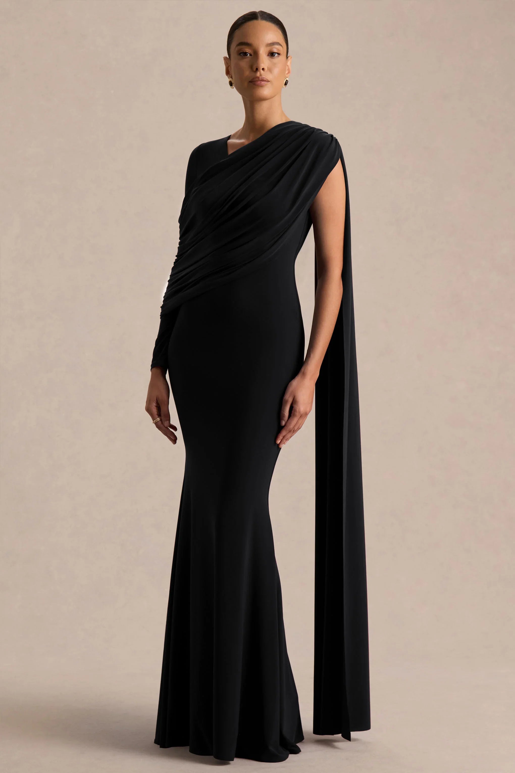 Introducing Rubelle, a striking design that embodies timeless elegance with a contemporary twist. Crafted from our premium stretch jersey in a rich black hue, this maxi dress drapes beautifully over the body for a flawless fit. The asymmetric neckline adds a modern edge, while the dramatic draped scarf detail cascades effortlessly for a touch of refined glamour. Rubelle is the ultimate choice for statement evening dressing.