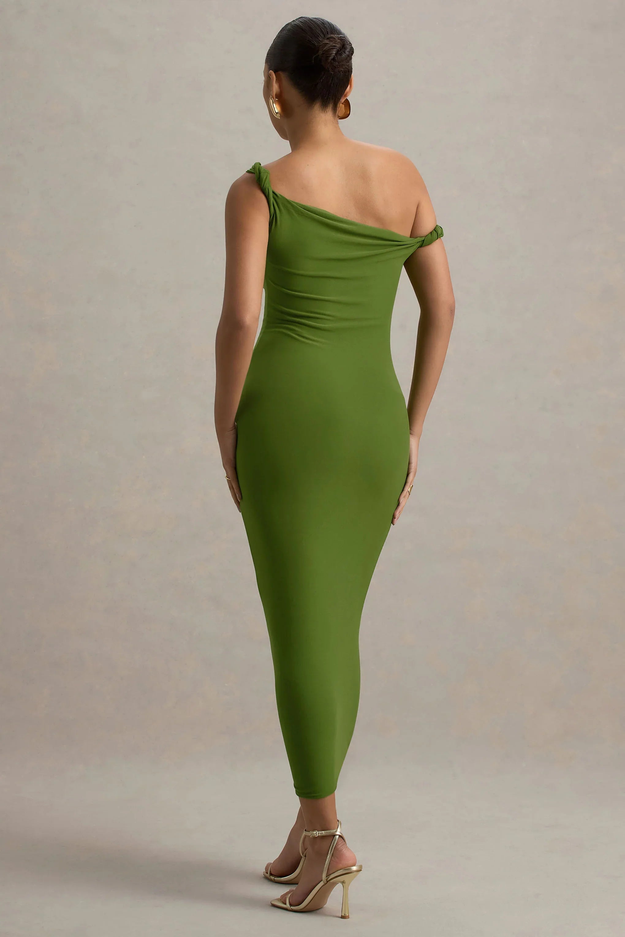 Minimalistic with a twist, say hello to Salome. This midi dress in green has been crafted in our premium brushed jersey for figure-flattering comfort. Detailed with an asymmetric twisted neckline for a new season shape, keep Salome at the forefront with a sleek updo and gold accents.