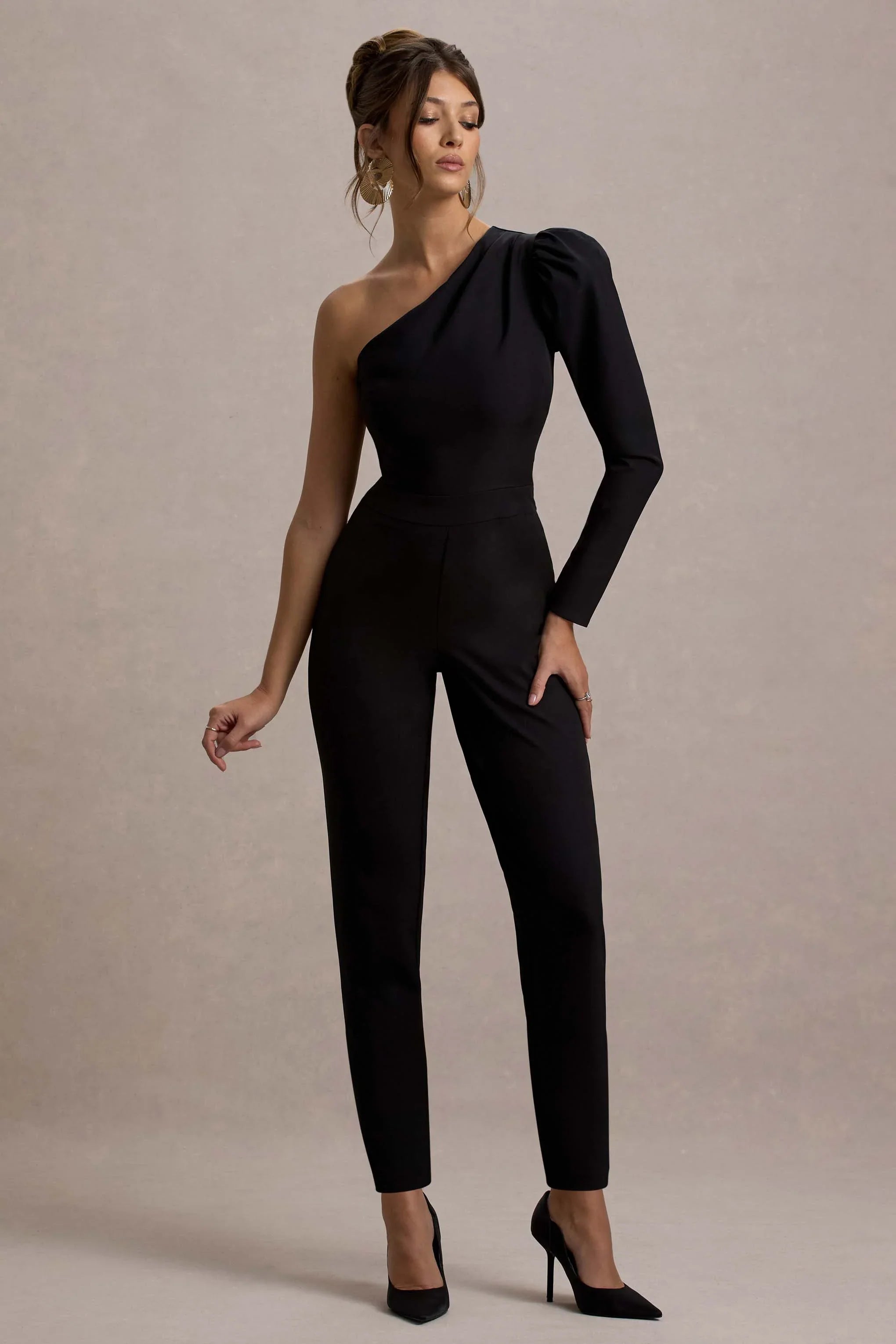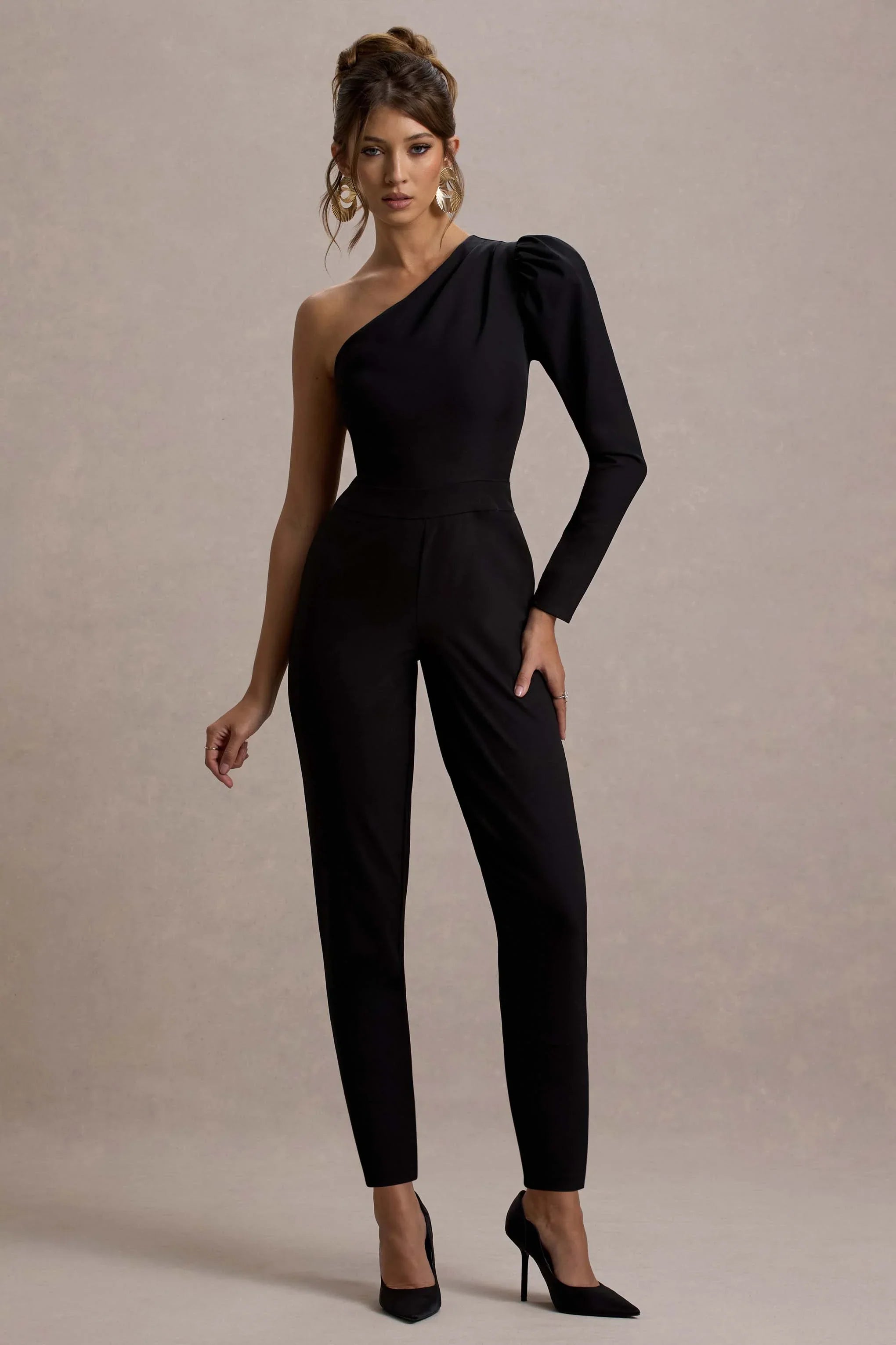 Effortlessly elegant, every wardrobe needs a staple like San Jose. Crafted in a timeless black shade of premium crepe, this tailored jumpsuit is detailed by an asymmetric neckline, single puff sleeve and straight legs. Elevate yours further with some bouncy curls and stilettos like Pluto.