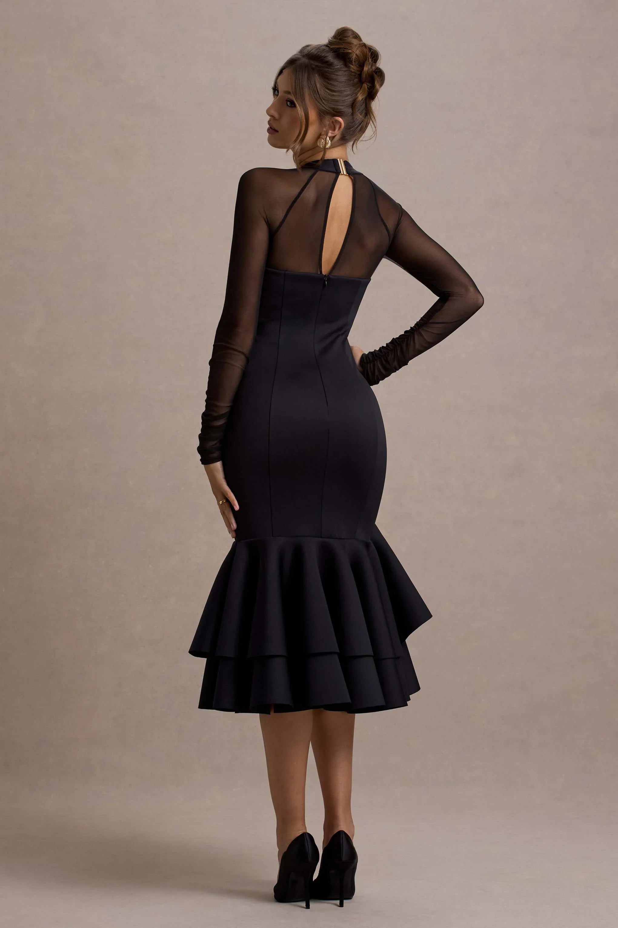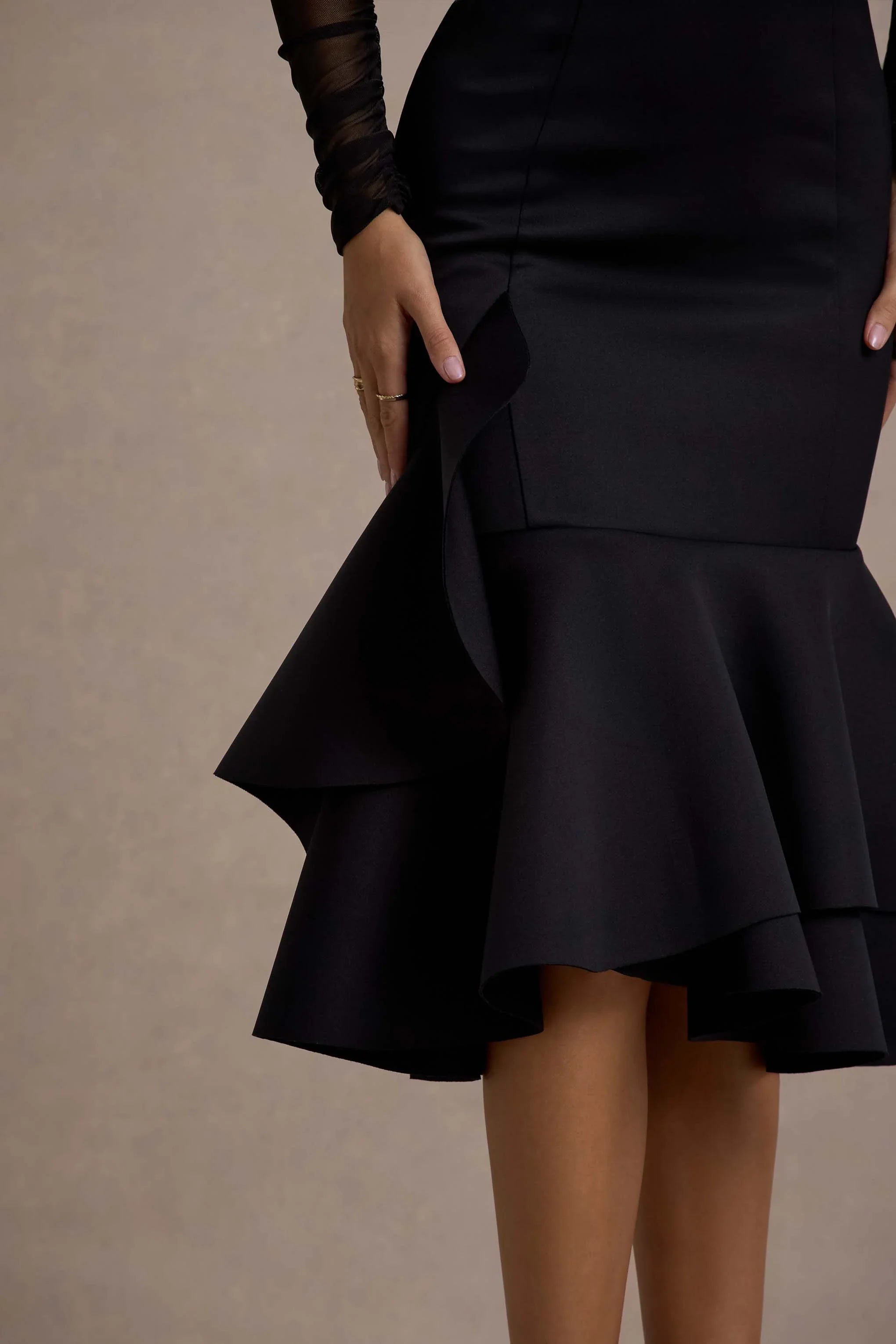 Defined by its striking textures and bold silhouette, Sander is the ultimate choice for a sophisticated night out. Crafted from luxurious mesh and sculpting scuba foam, this black midi dress features long sheer sleeves that balance elegance with allure. The design is finished with a statement ruffle hem, adding movement and drama to every step.