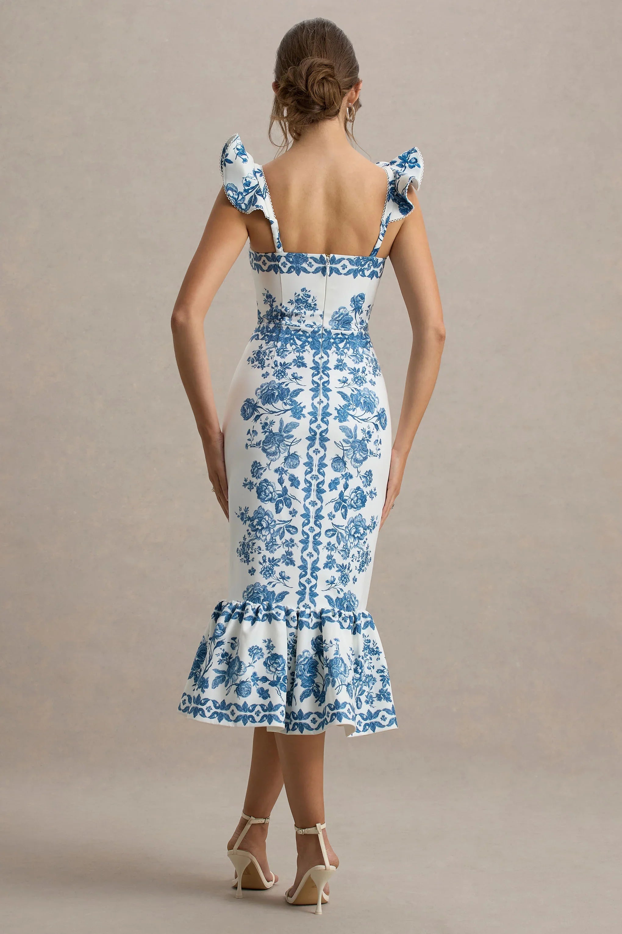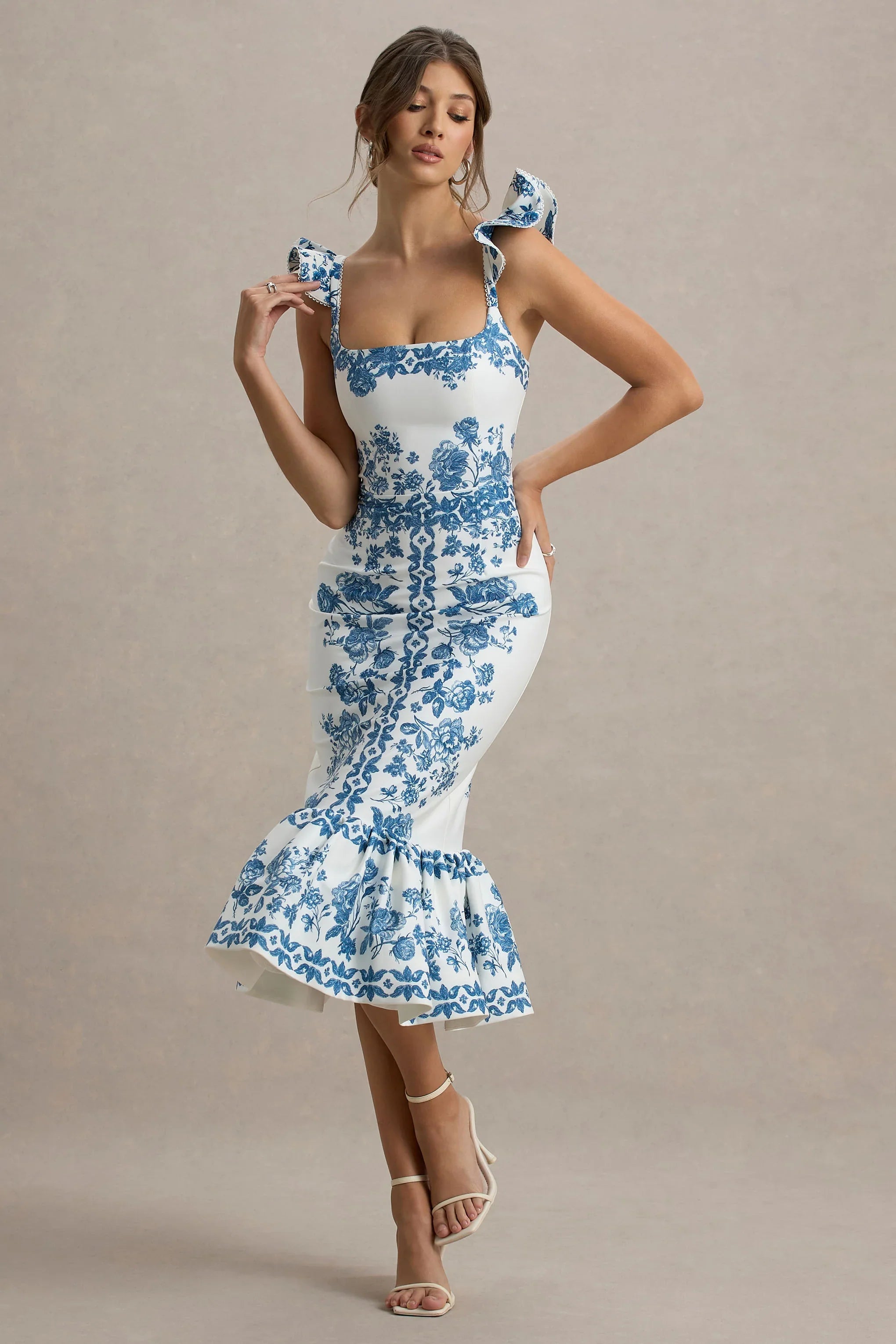 Sarey is the perfect choice for your next summer getaway. Crafted in our premium woven is a striking blue porcelain print, this midi showcases gorgeous ruffle details and a frilled hemline for the ultimate touch of femininity. Style yours with subtle accents to let Sarey capture all the attention at your next sunset dinner date.