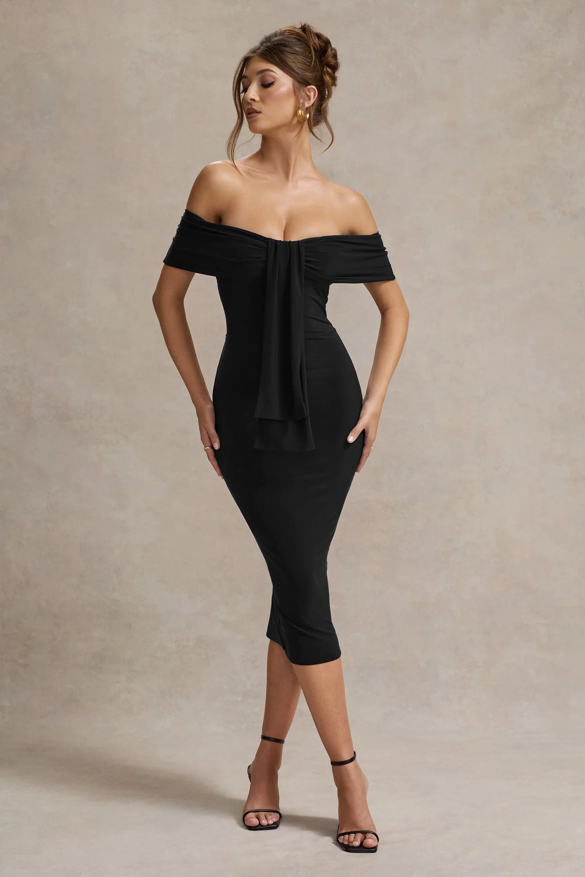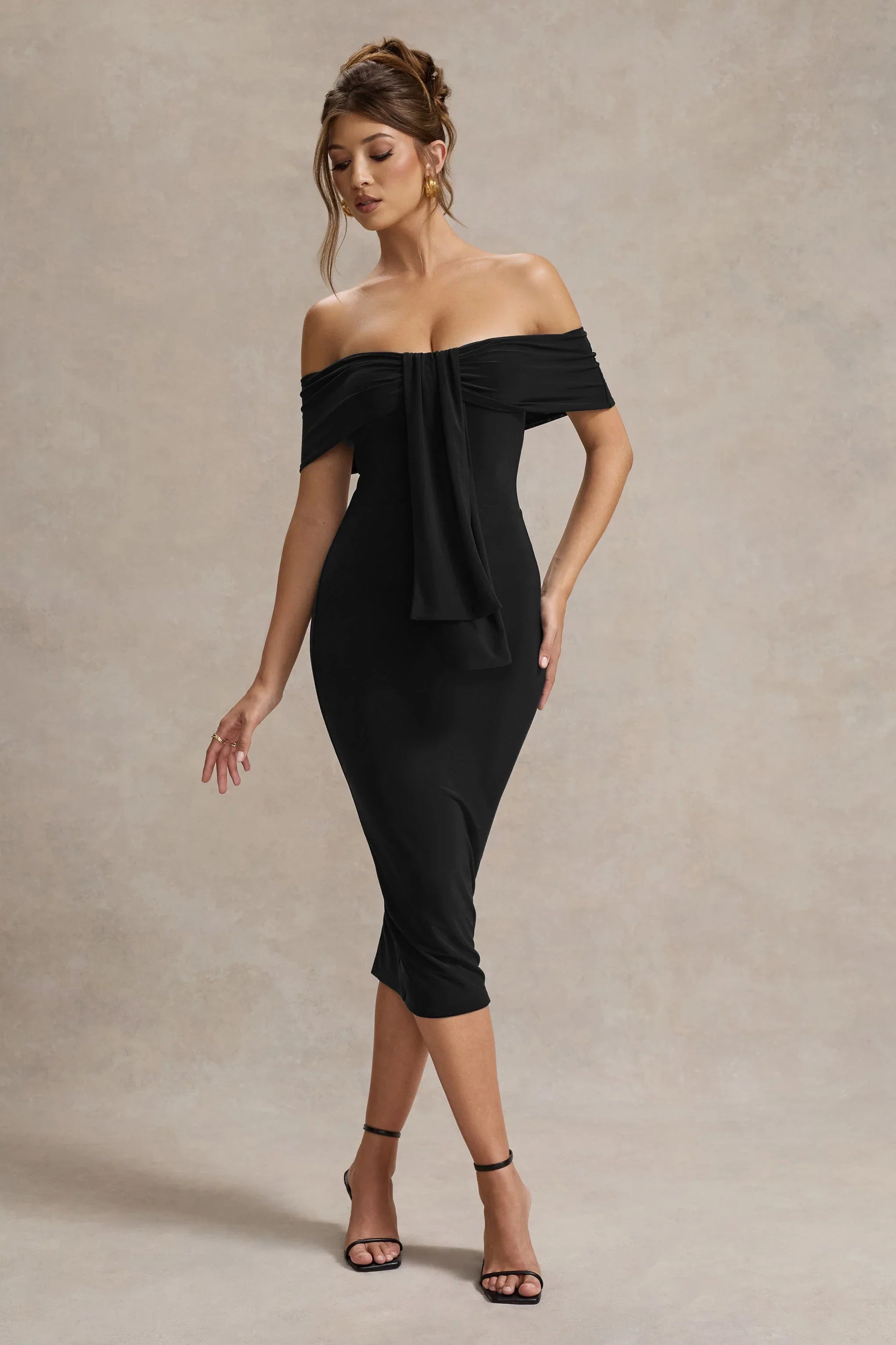 Designed to see you through any occasion, Selbie is a sophisticated staple for every wardrobe. Arriving in a timeless black shade of our premium jersey, this curve-enhancer features a bardot neckline highlighted by an elegant centre drape. For the perfect occasion attire, style yours with some statement earrings like Roxana.
