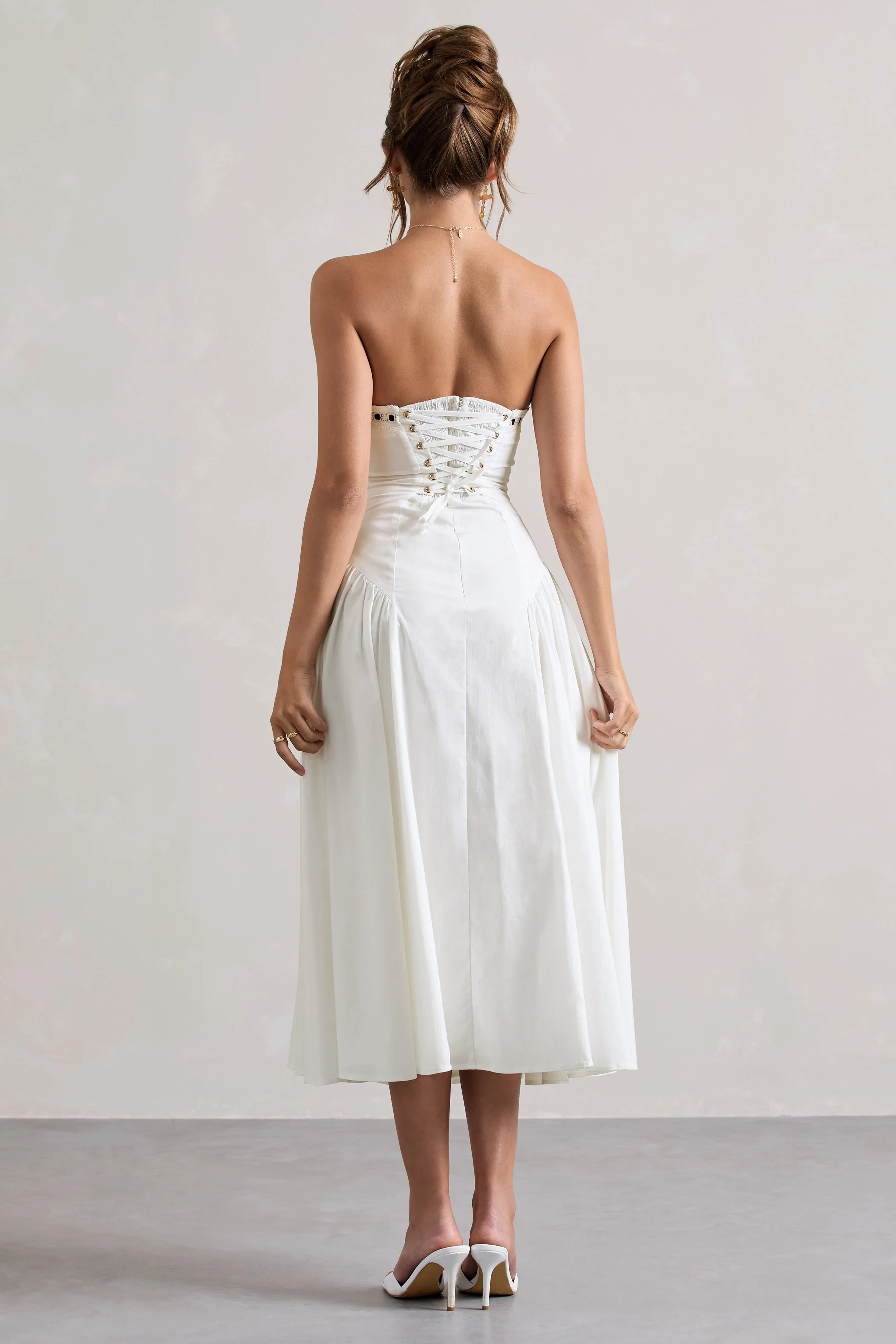 Designed for spontaneous daytime plans and sun-kissed evenings, Serrenti is a romantic addition to every wardrobe. Made from a crisp cotton poplin that holds its breezy shape, this white midi dress hugs your curves before falling to a contemporary drop-waist. Show off Serrenti's self-tie strapless neckline by styling yours with an effortless tousled bun.