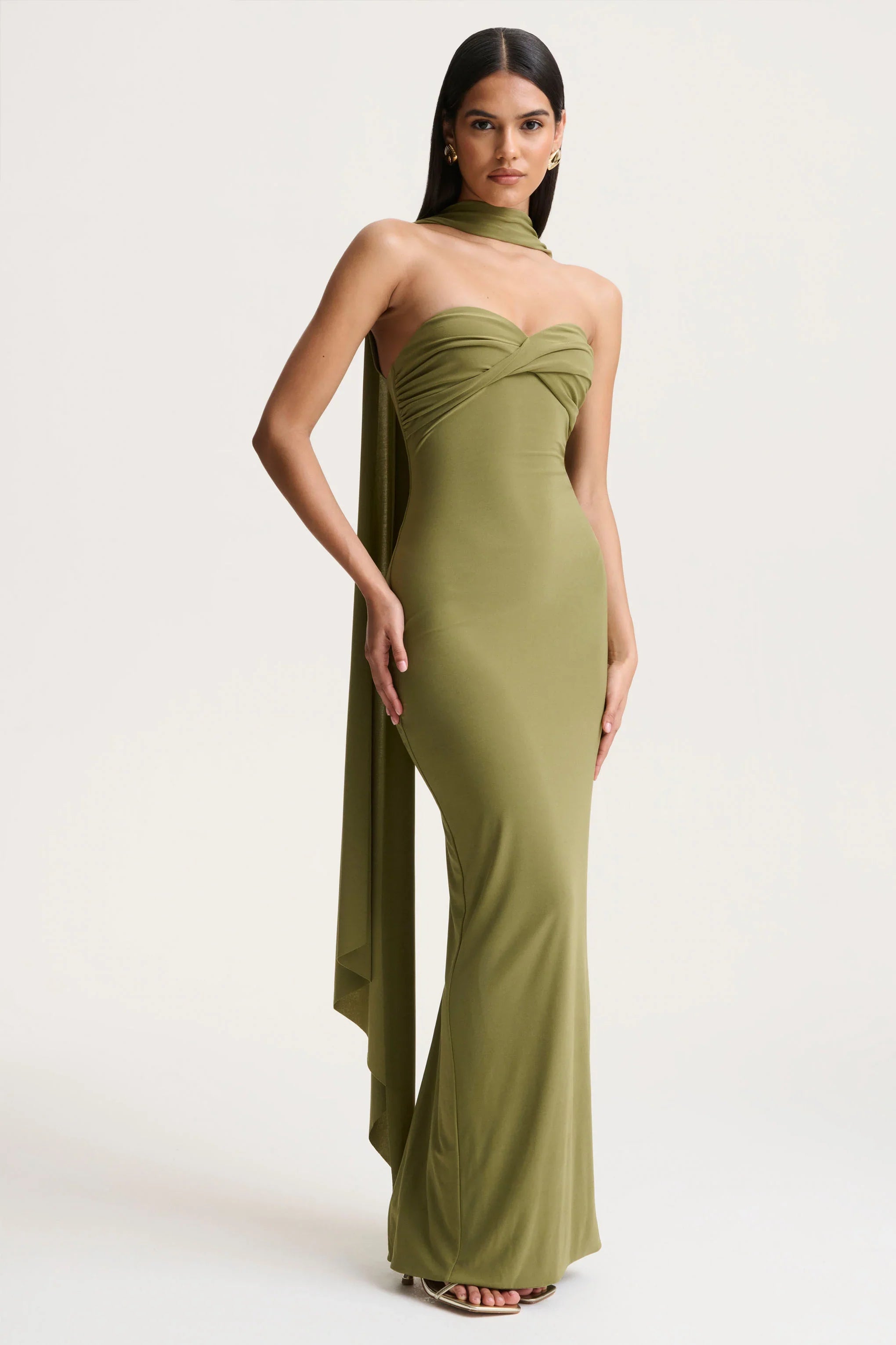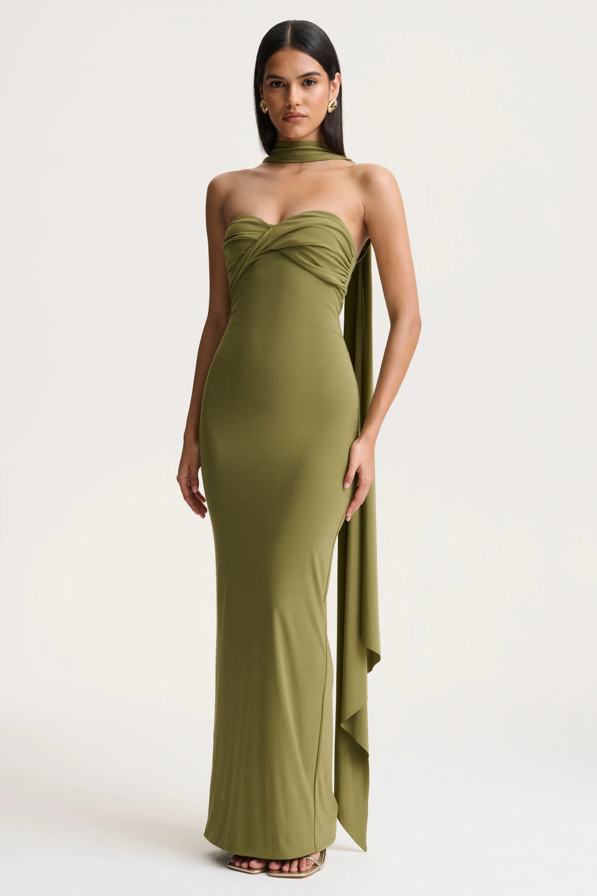 Say hello to Sheila, an effortlessly elegant design with a modern twist. Crafted from our premium stretch jersey in timeless olive, this maxi dress features a twisted bandeau neckline that accentuates the shoulders and décolletage. The chic scarf detail adds a touch of drama, while the centre-back split ensures graceful movement. Sleek, refined, and endlessly flattering, Sheila is made for unforgettable evenings.