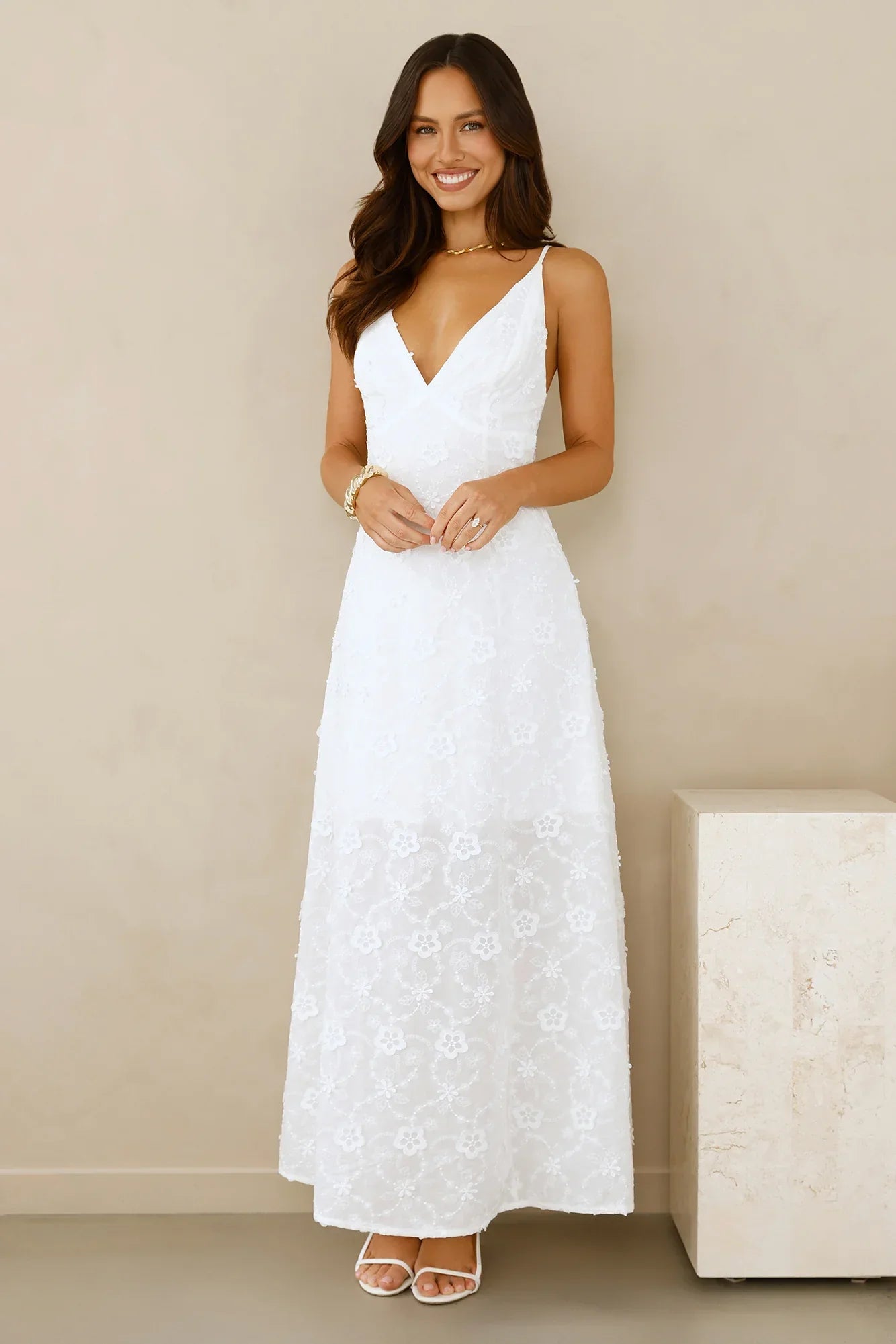 The Soft Moonbeam Maxi Dress exudes romance with its delicate embroidery, flowy skirt, and elegant tie-up back. Style it with strappy heels and soft waves for a dreamy look we love.