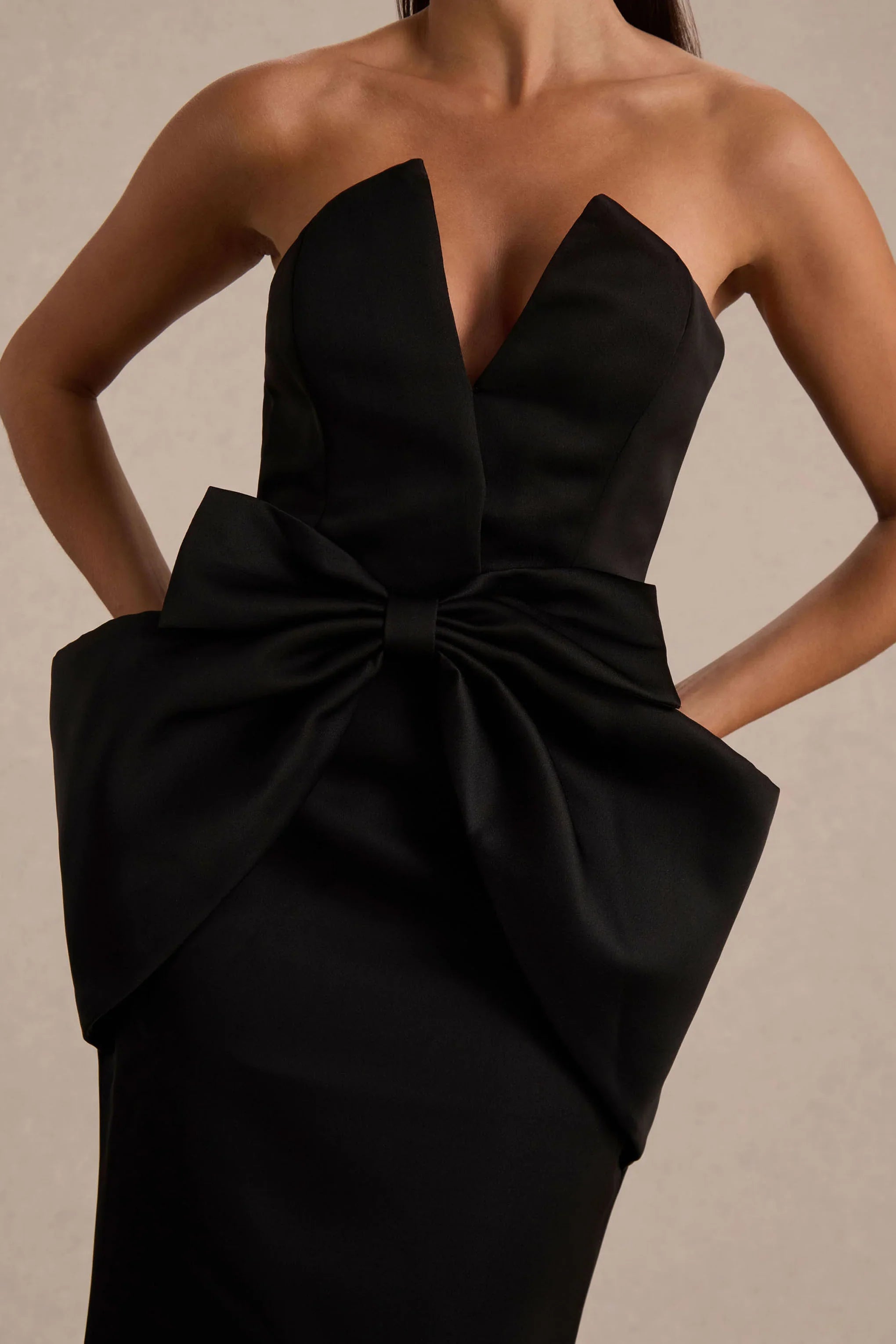 Featuring a chic bandeau neckline and a playful bow detail, this dress blends sophistication with a touch of modern glamour. Its flowing maxi length creates a sleek, elongated silhouette, making it perfect for dressed up evenings and special occasions.