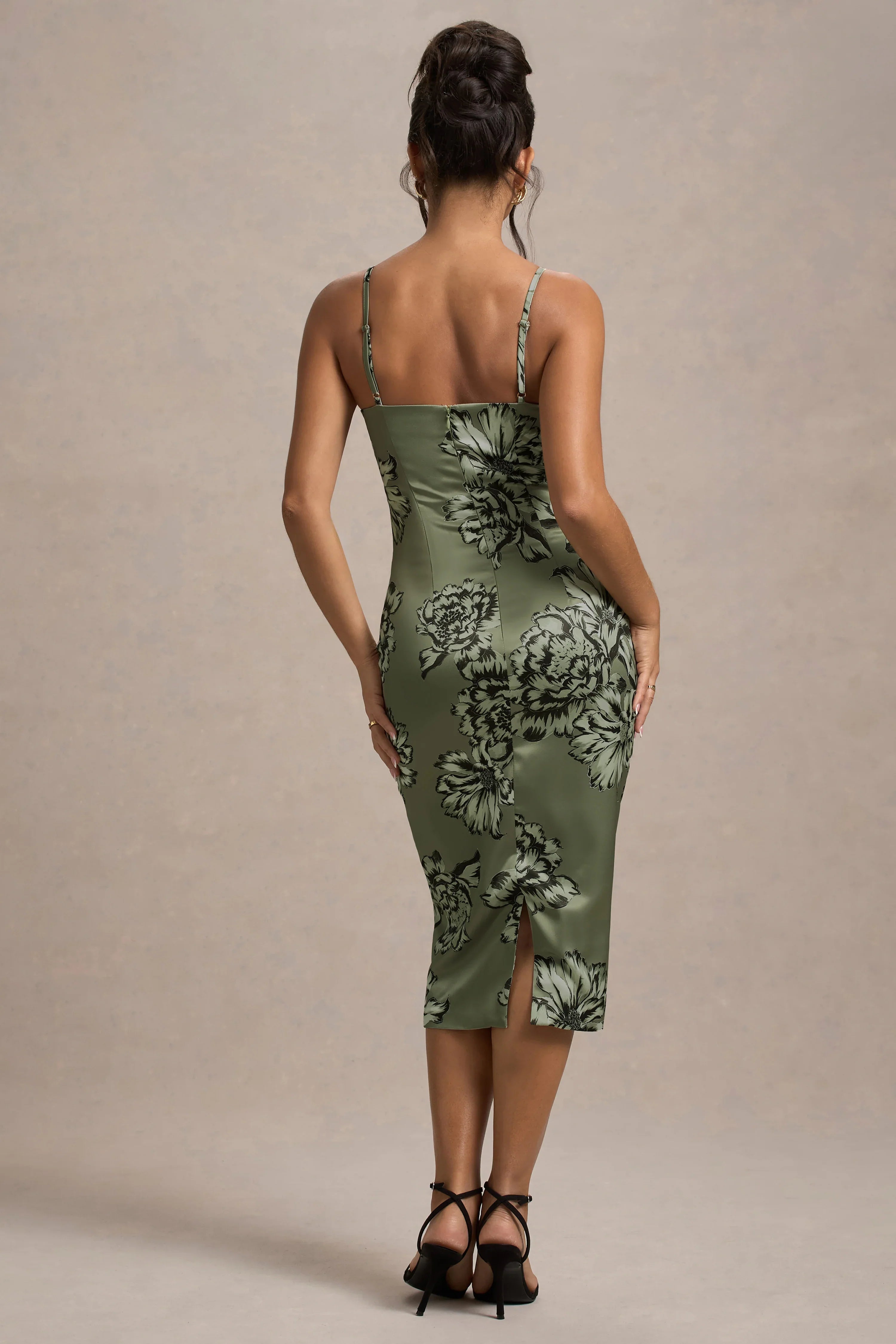 Sculpt your silhouette in Soprano, our sultry midi dress. Crafted in an irresistible olive print of our premium satin, this bodycon is defined by soft lace trims, supportive padded cups and gold-trimmed adjustable cami straps.