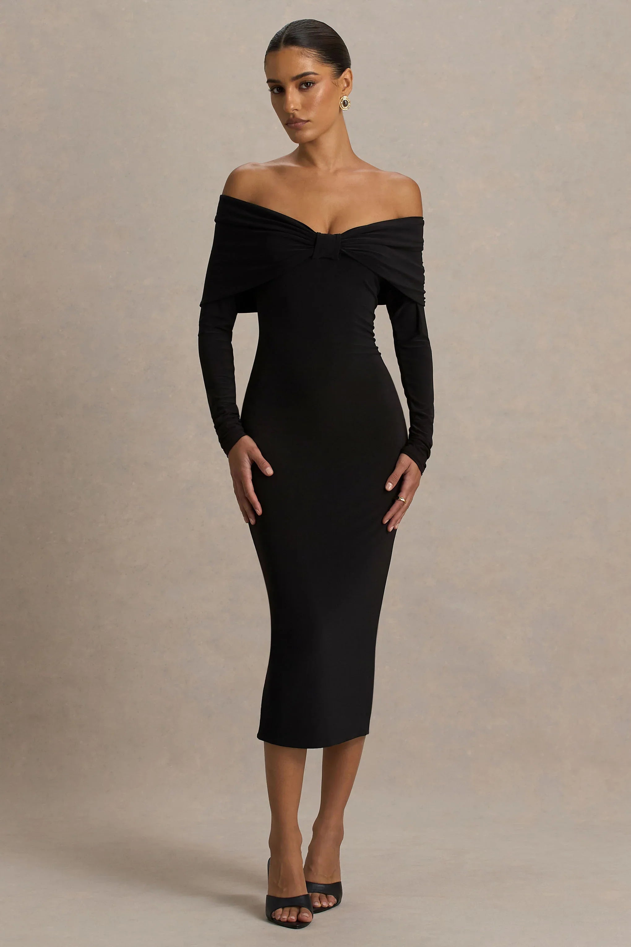 Turn heads effortlessly in Spark, a dress designed for unforgettable entrances. Cut from our premium stretch jersey in a rich black hue, this midi-length piece sculpts your figure while offering a luxurious edge . The elegant bardot neckline frames the décolletage, complete with a delicate bow detail for a touch of femininity. The long sleeves and ruched detailing enhance the sleek silhouette, while the centre-back split ensures ease of movement with a hint of allure. Effortlessly chic, Spark is the definition of understated glamour.