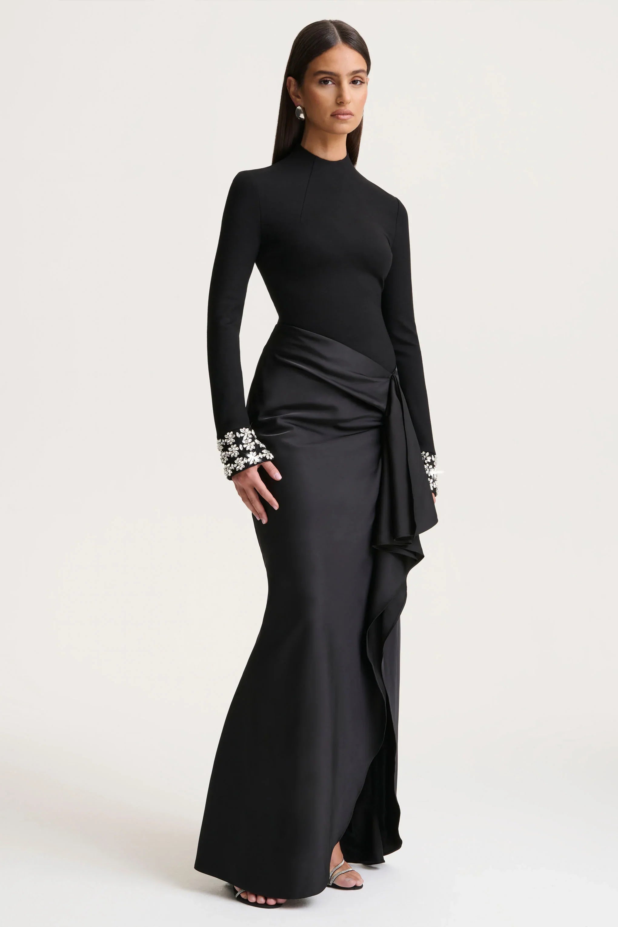 Say hello to Starred, a timeless fusion of sophistication and glamour. Crafted from our premium ponte and satin in a classic black hue, this maxi dress offers a sculpted silhouette that exudes elegance. The high neckline and long sleeves create a refined shape, while the hand-embellished cuffs add a touch of sparkle. Finished with a fluid satin wrap skirt that moves beautifully with every step, Starred is made for evenings that command attention.