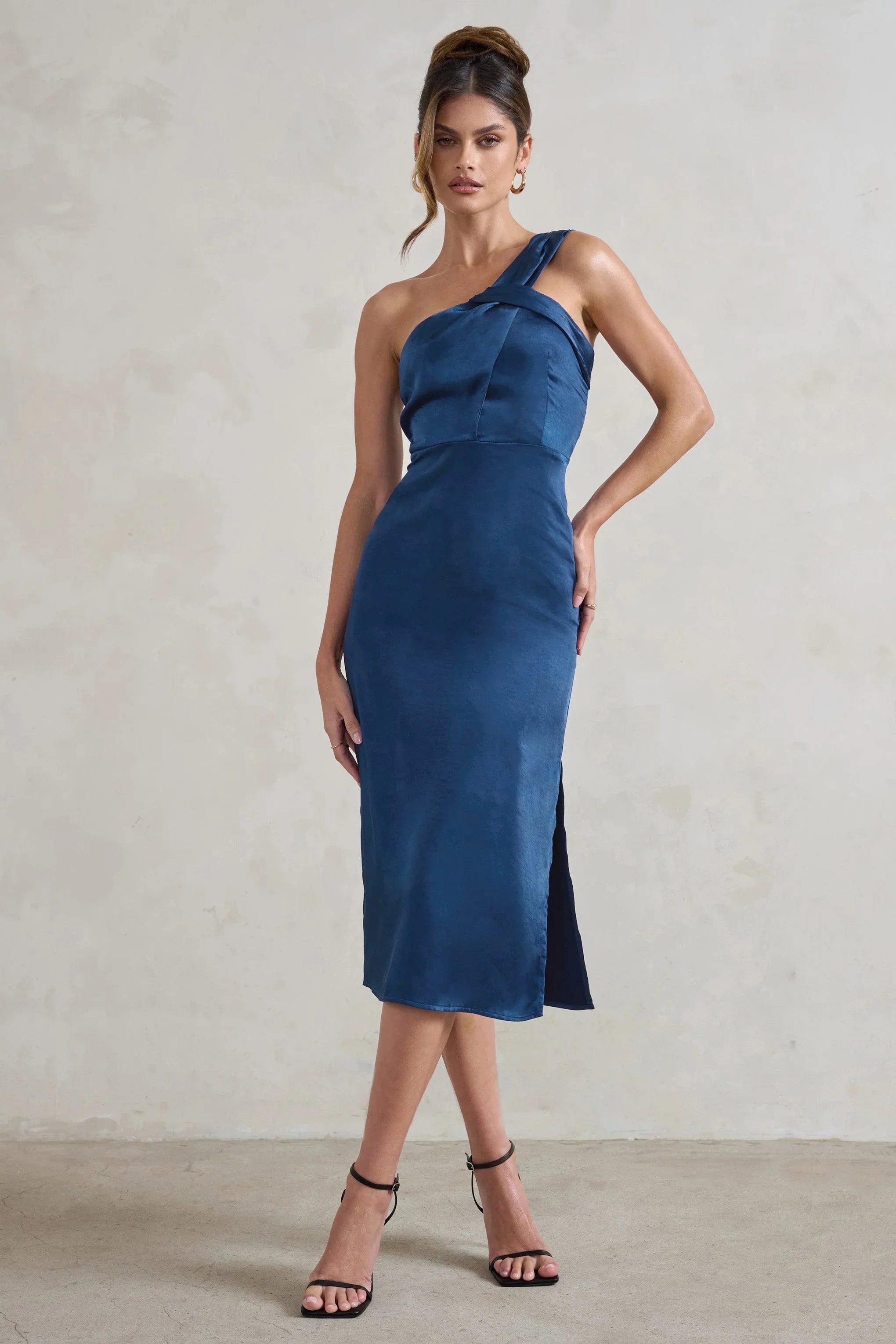 Wedding guests and prom attendees will be unforgettable in our sophisticated Steffie dress. Exclusively designed and undoubtedly elegant, this must-have midi features a asymmetric bodice wrapped in layers of premium navy satin. The same silken fabric shapes a fluid knee-length skirt so you can dance until your heels come off.