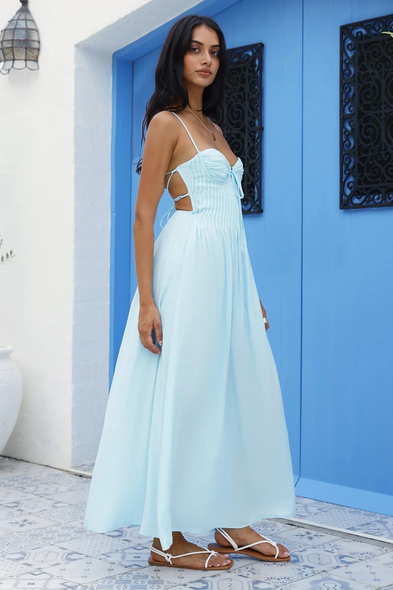 Float through sun-drenched days in our Summer Dreaming Maxi Dress in Blue. Featuring a romantic sweetheart neckline with delicate tie detail and pintuck pleating, this dress embodies effortless Mediterranean charm. The flowing silhouette in soft, breathable fabric cascades to a graceful ankle length, perfect for catching gentle summer breezes.