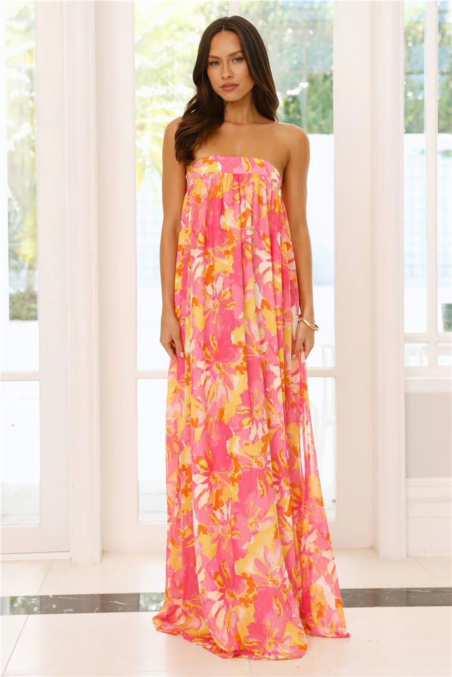 The Sunshine State Of Mind Strapless Maxi Dress is a breezy tent-style silhouette with an elastic back and tie detail for a comfortable fit. The vibrant print adds a playful touch, and the slip-on design makes it effortless to wear. Perfect for sunny days, style it with your favourite sandals for a laid-back, summer vibe.
