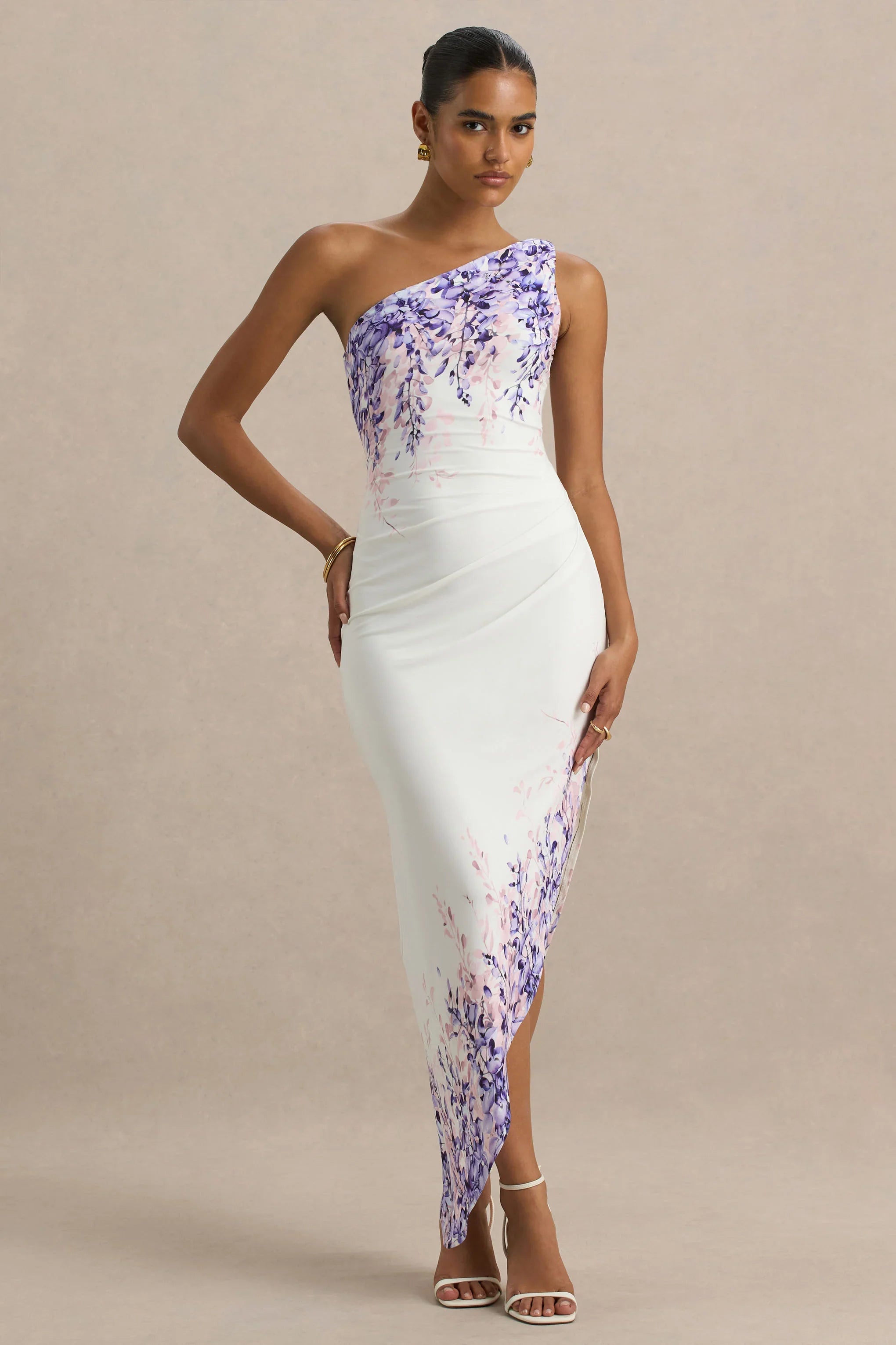 Feminine with a touch of edge, Sybil is the ultimate figure-flattering statement. Cut from our premium stretch jersey in a romantic purple floral print, this midi dress is perfect for making an entrance. Featuring an asymmetric neckline and hemline for a, sculpted silhouette. Completed with ruched detailing that enhances your curves in all the right places, creating a sleek and confident finish. Style Sybil for weddings, garden parties, or sunset cocktails, with delicate jewellery.