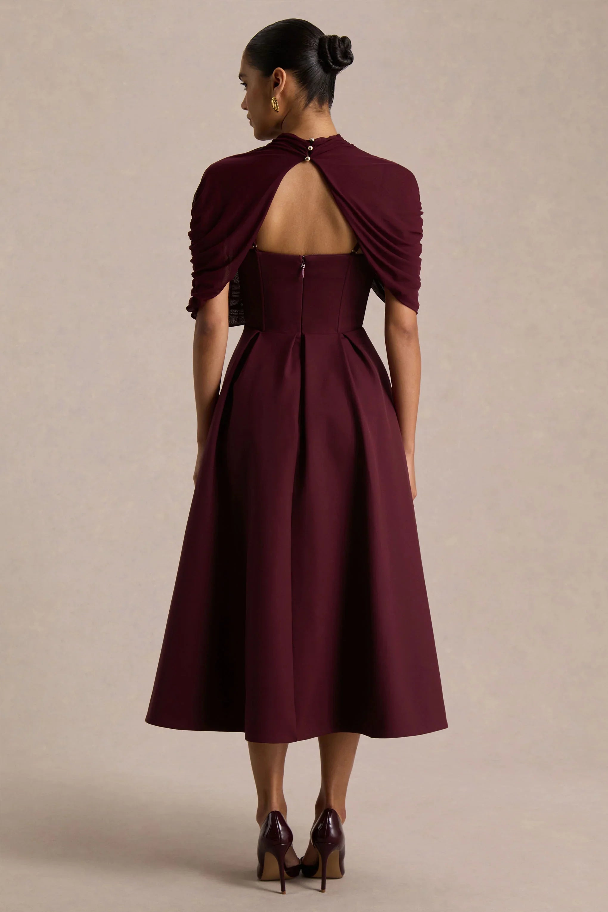 Exude refined elegance in Thalia, a timeless staple every girl needs. Crafted from a rich burgundy tone of our premium crepe, this midi accentuates your figure seamlessly. Thalia features a detachable, sheer, mesh cape allowing you to transform your look, from a refined high-neck silhouette to a modern square neckline with effortless ease. Finished with adjustable straps ensure a flawless fit while the flared skater skirt adds movement and sophisticated charm. With its impeccable tailoring and chic versatility, Thalia embodies understated luxury and modern glamour.