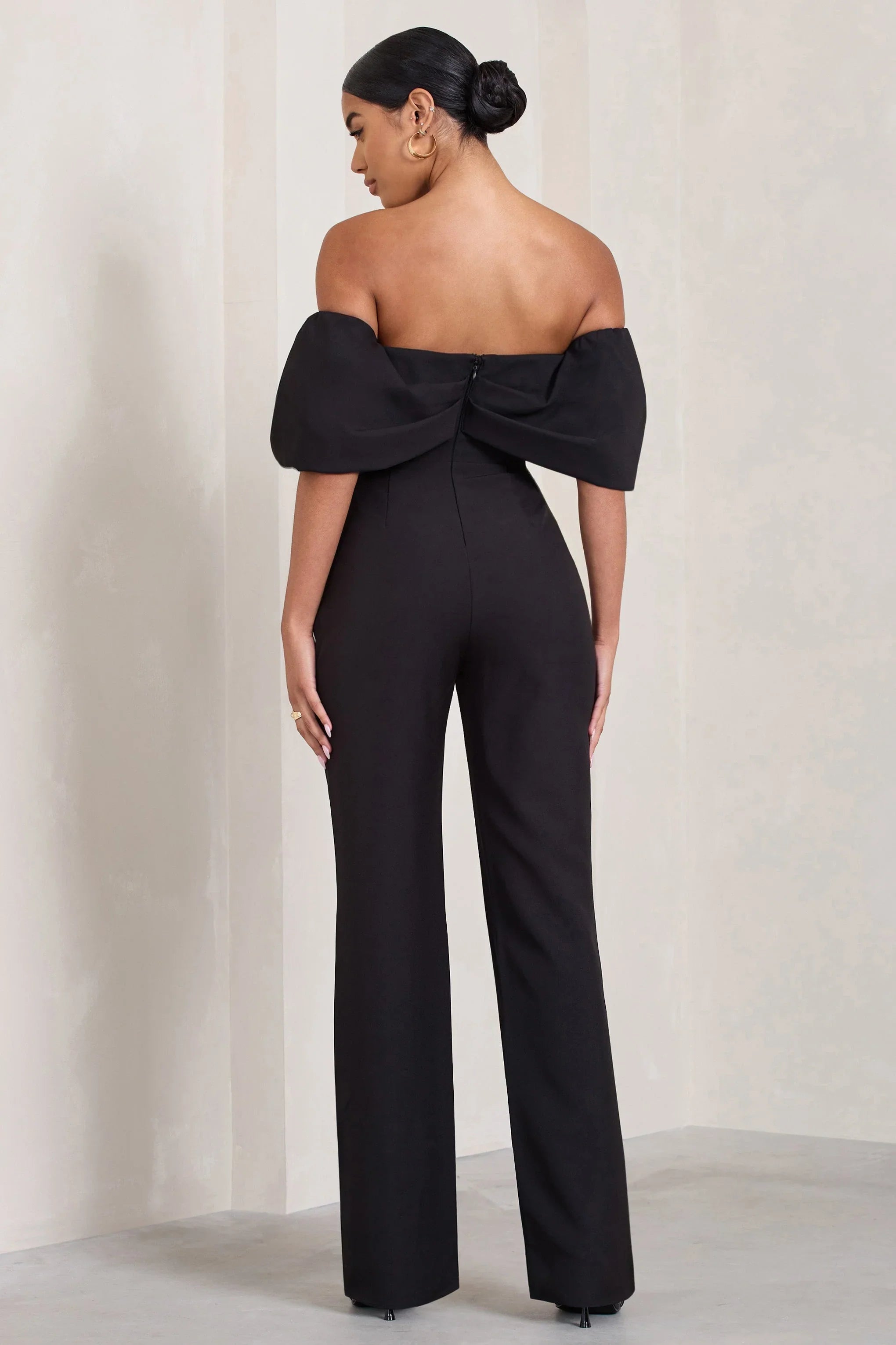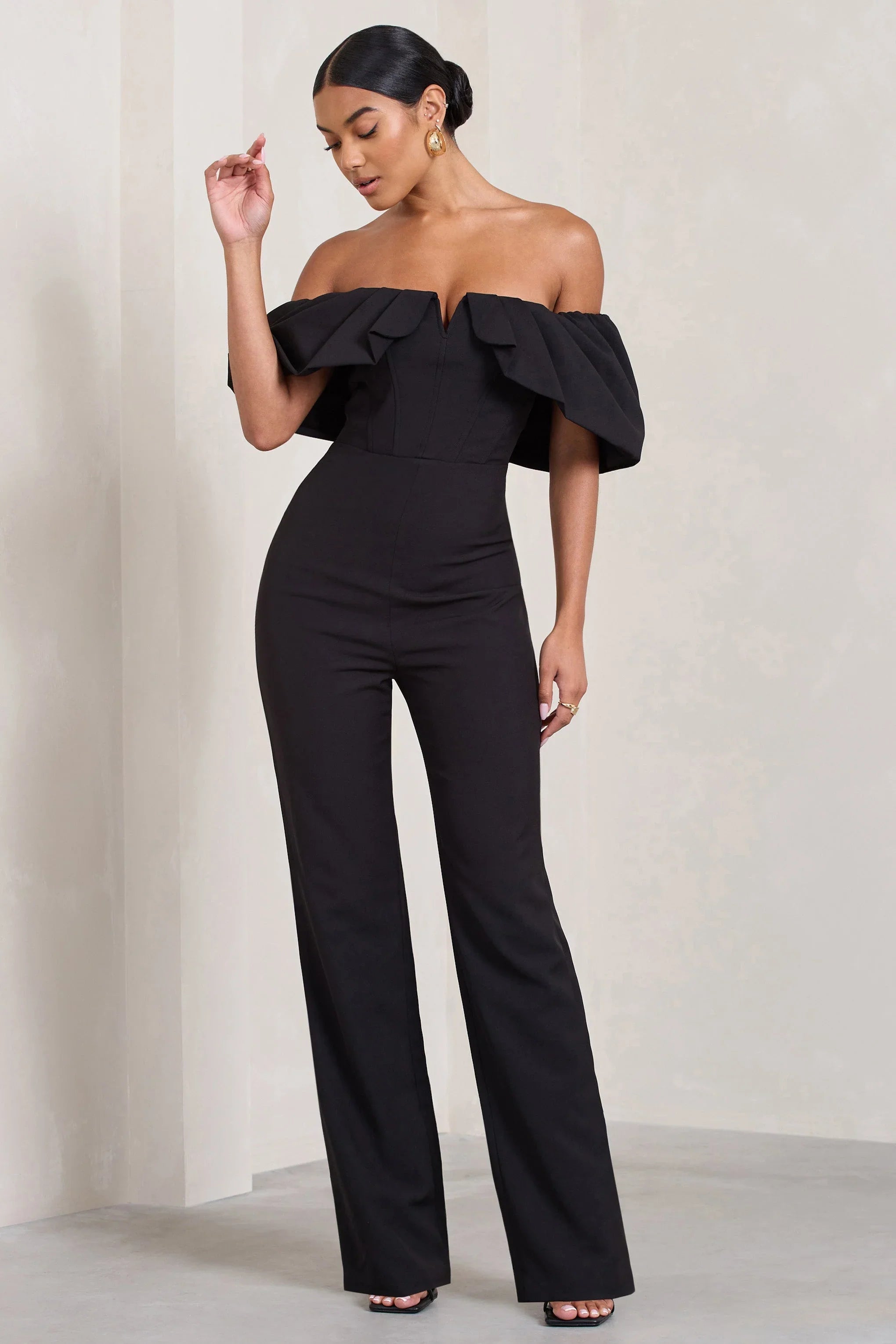 Time Will Tell is the form-fitting jumpsuit to stand out in any lavish evening setting. Crafted in a premium black crepe with supportive stretch and structured boning, this Bardot jumpsuit boasts voluminous short sleeves that drape off each shoulder and long wide legs. Style this special occasion staple with diamond drop earrings for timeless appeal.