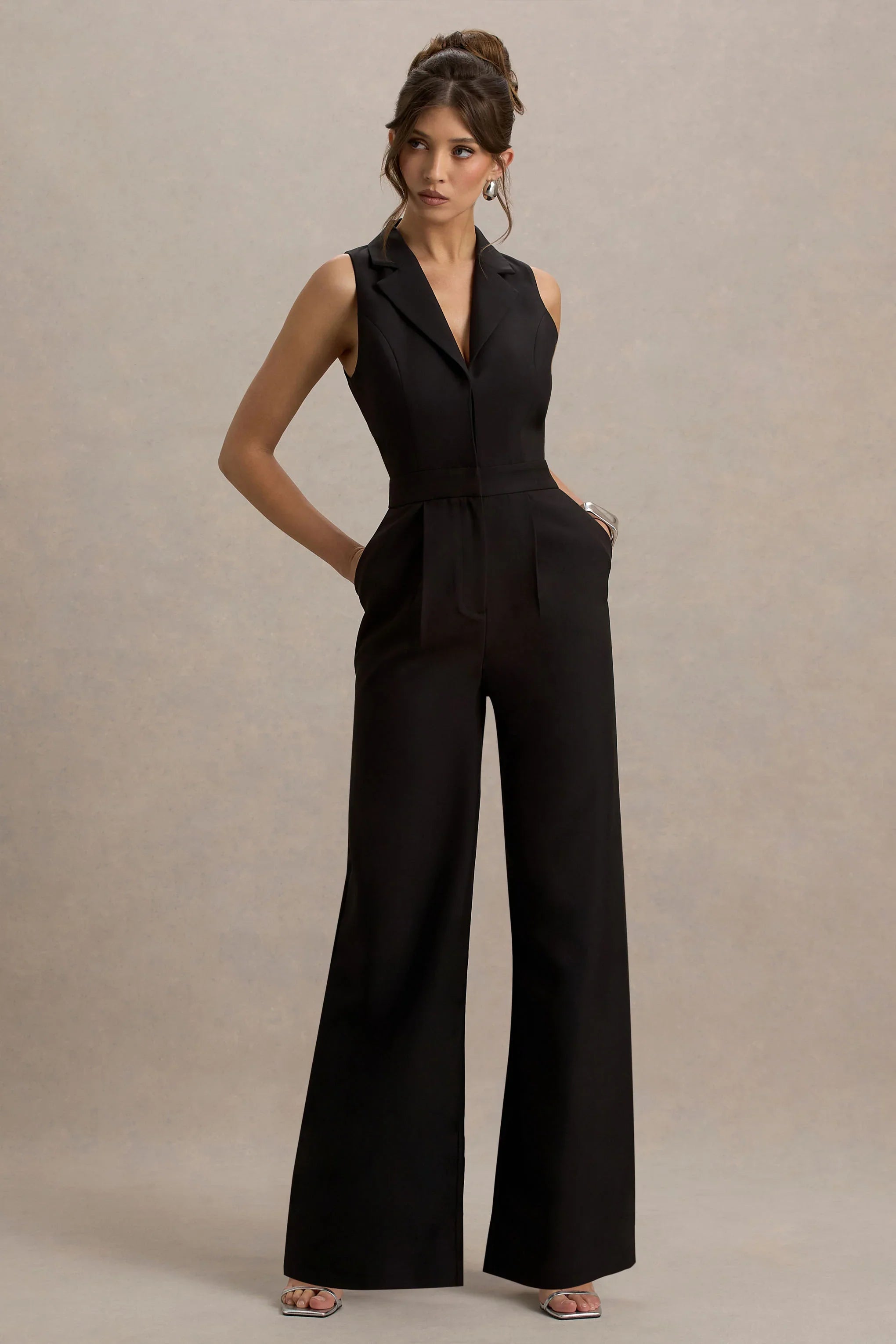 Command the room in Trixie, a sleek jumpsuit designed to flatter and empower. Curated in a classic black shade of our premium stretch crepe, for a sculpted fit. This sleeveless silhouette is framed by a tailored collar and boasts a plunge neckline, bringing a sophisticated edge to this piece. Finished with a high waist to enhance your curves and figure, in Trixie you will exude confidence. Style with a sleek heel for cocktail evenings all season long.