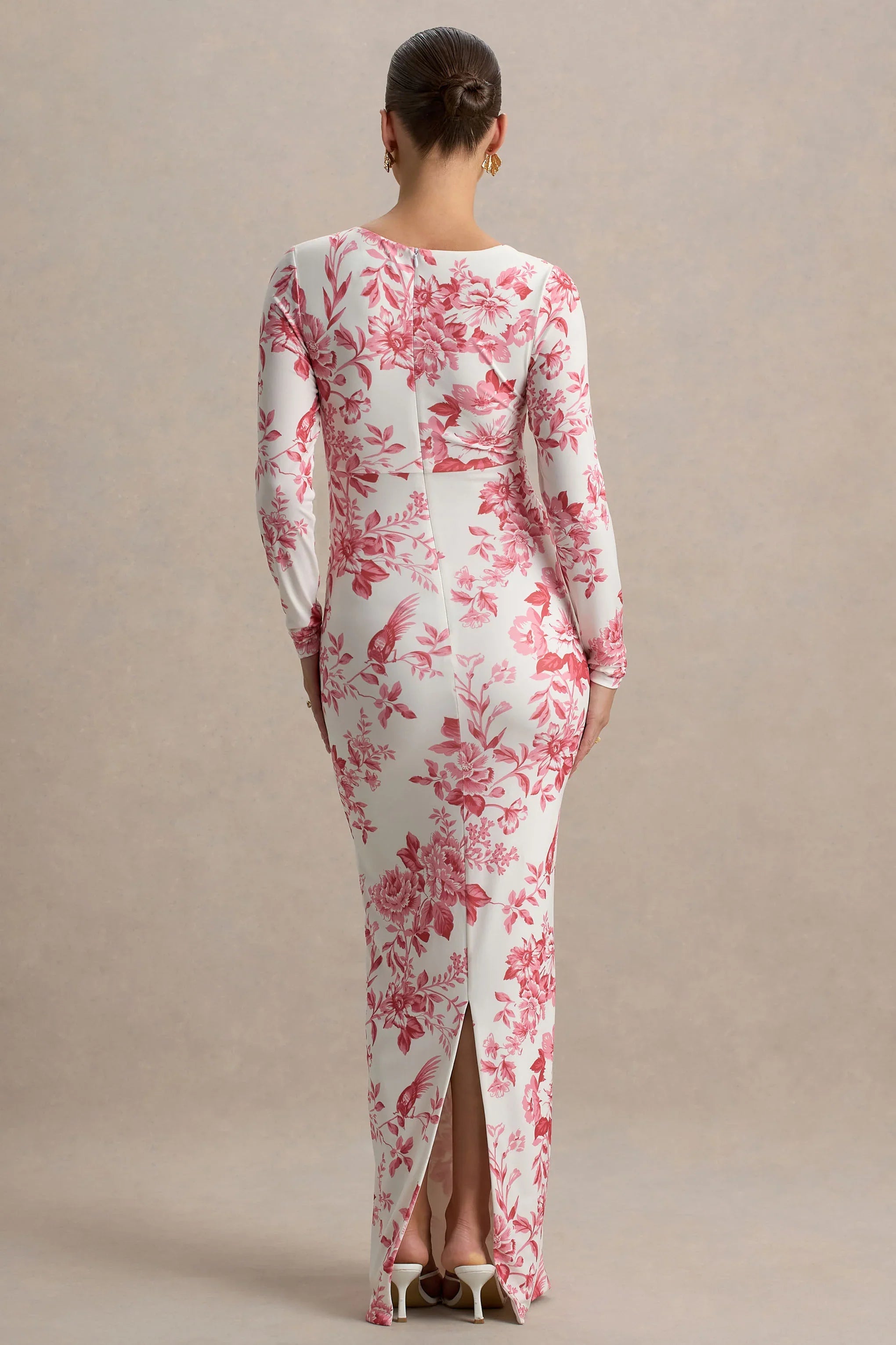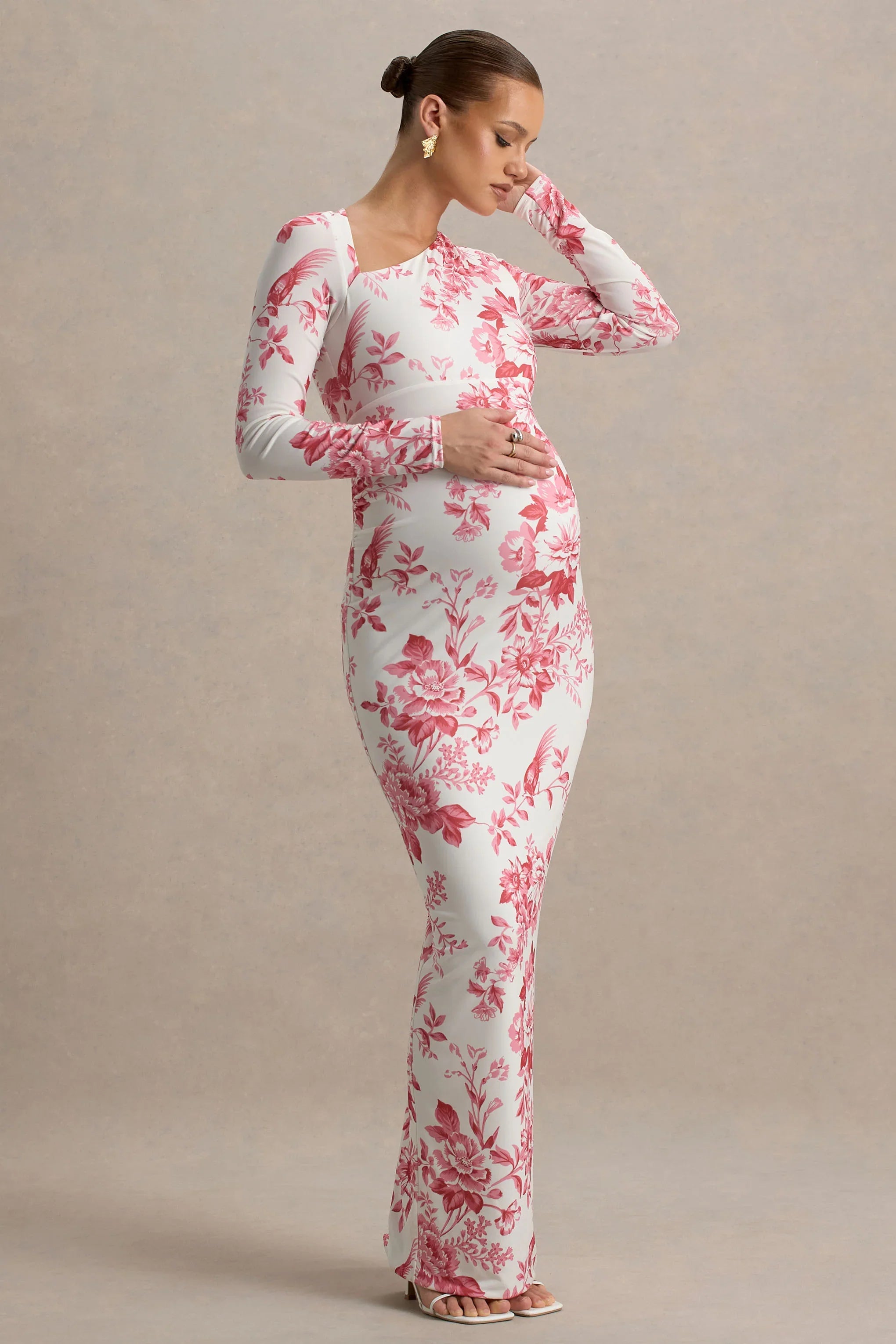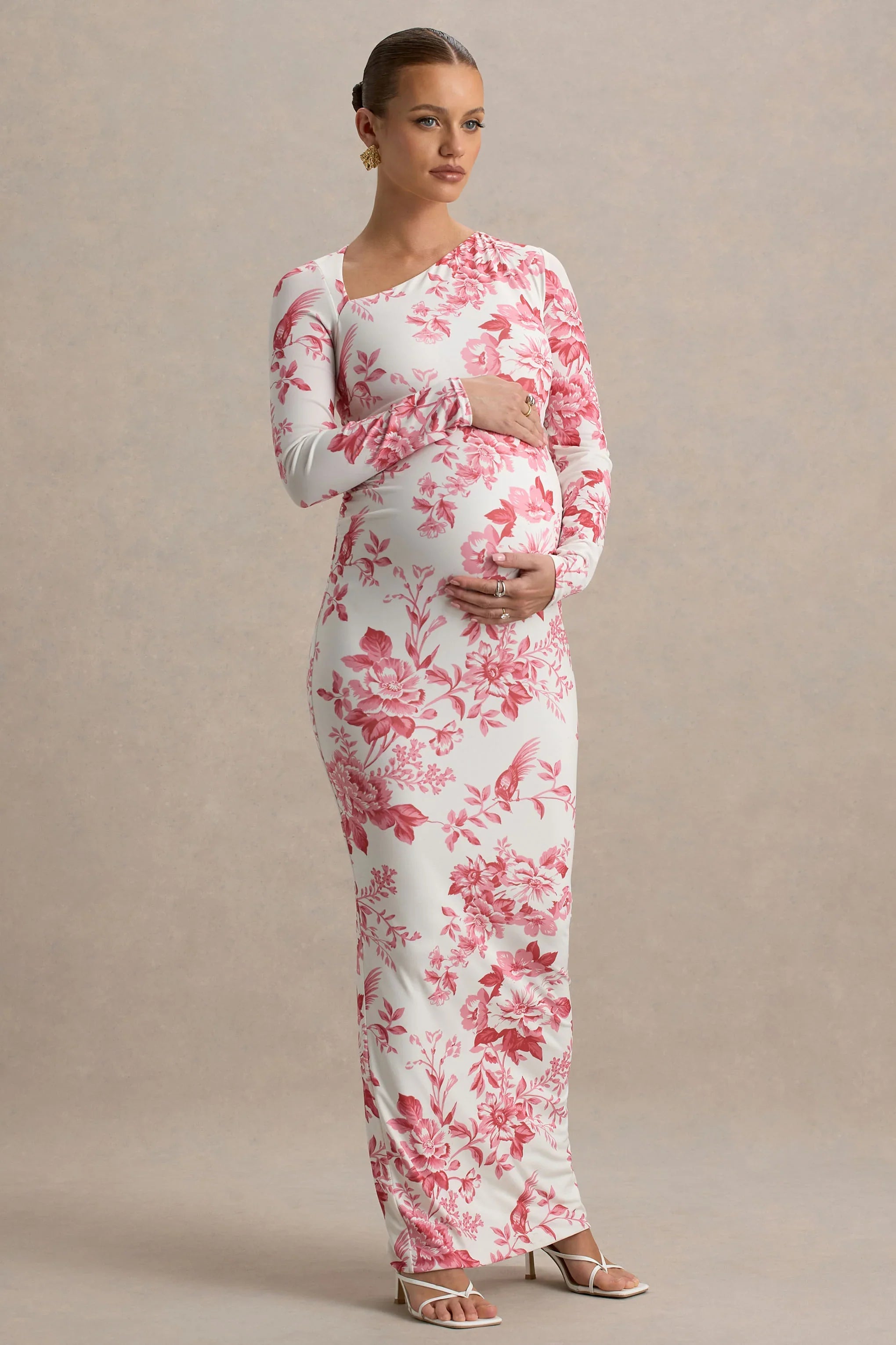 Bloom with confidence in our Vanette maxi, designed for both elegance and comfort, its the perfect maxi for your spring summer wadrobe. Crafted from our premium stretch jersey, to hug your figure beautifully whilst ensuring comfort. The pink floral print brings femininity, while the asymmetric neckline and statement bell sleeves add a touch of modern sophistication. Thoughtfully designed with ruching at the bump to enhance your silhouette, this dress is ideal for baby showers and special occasions.