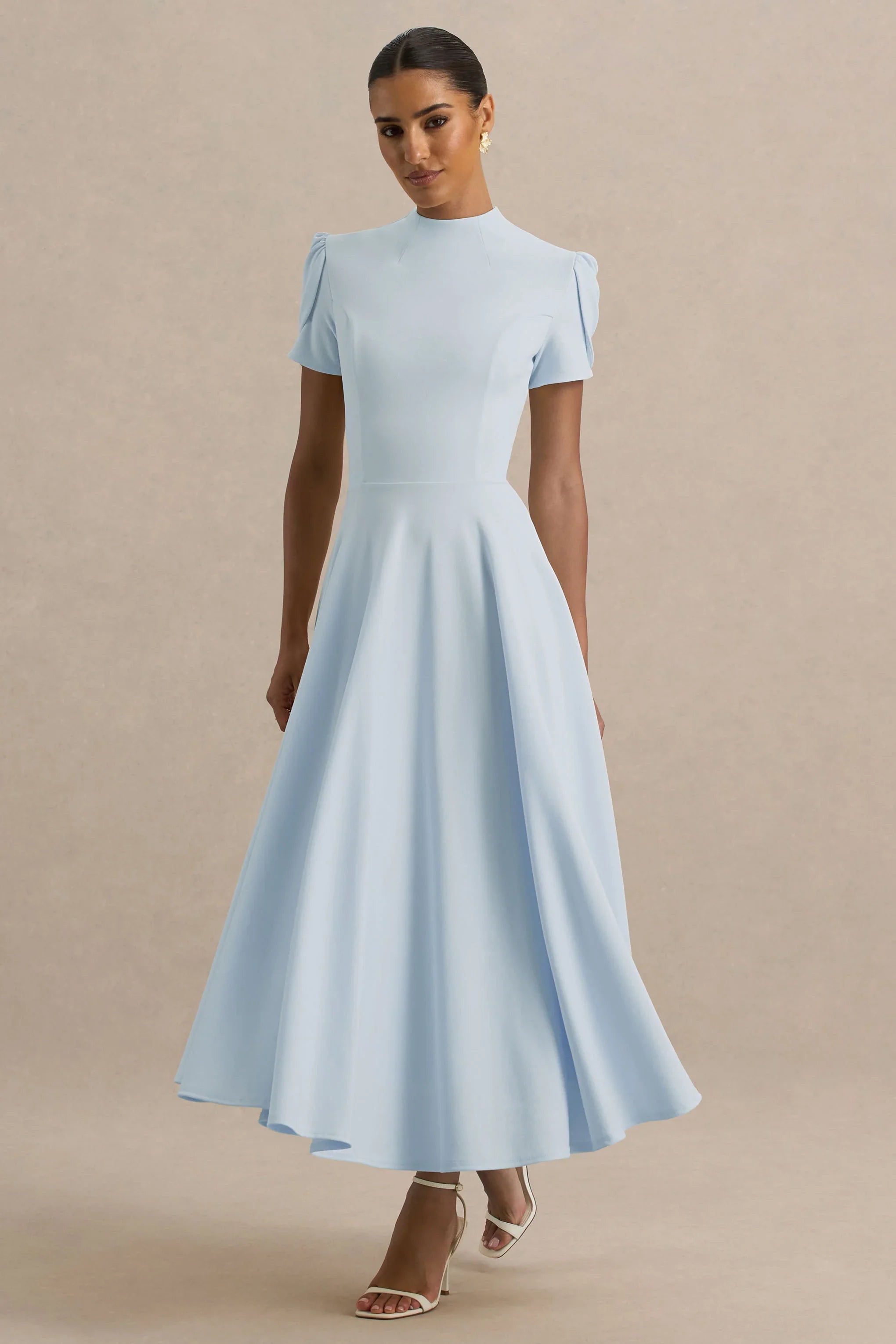Charm with timeless elegance in our Vicky dress. Crafted from our premium scuba in a bold powder blue shade, this midi dress will be your new go-to for sophisticated styling with a touch of drama. Designed to sculpt and flatter, this figure enhancing midi features a structured high neckline and short tulip sleeves for a modern yet feminine silhouette. Vicky is the perfect piece to style this season, from weddings to races, for an entrance that guarantees all eyes on you.