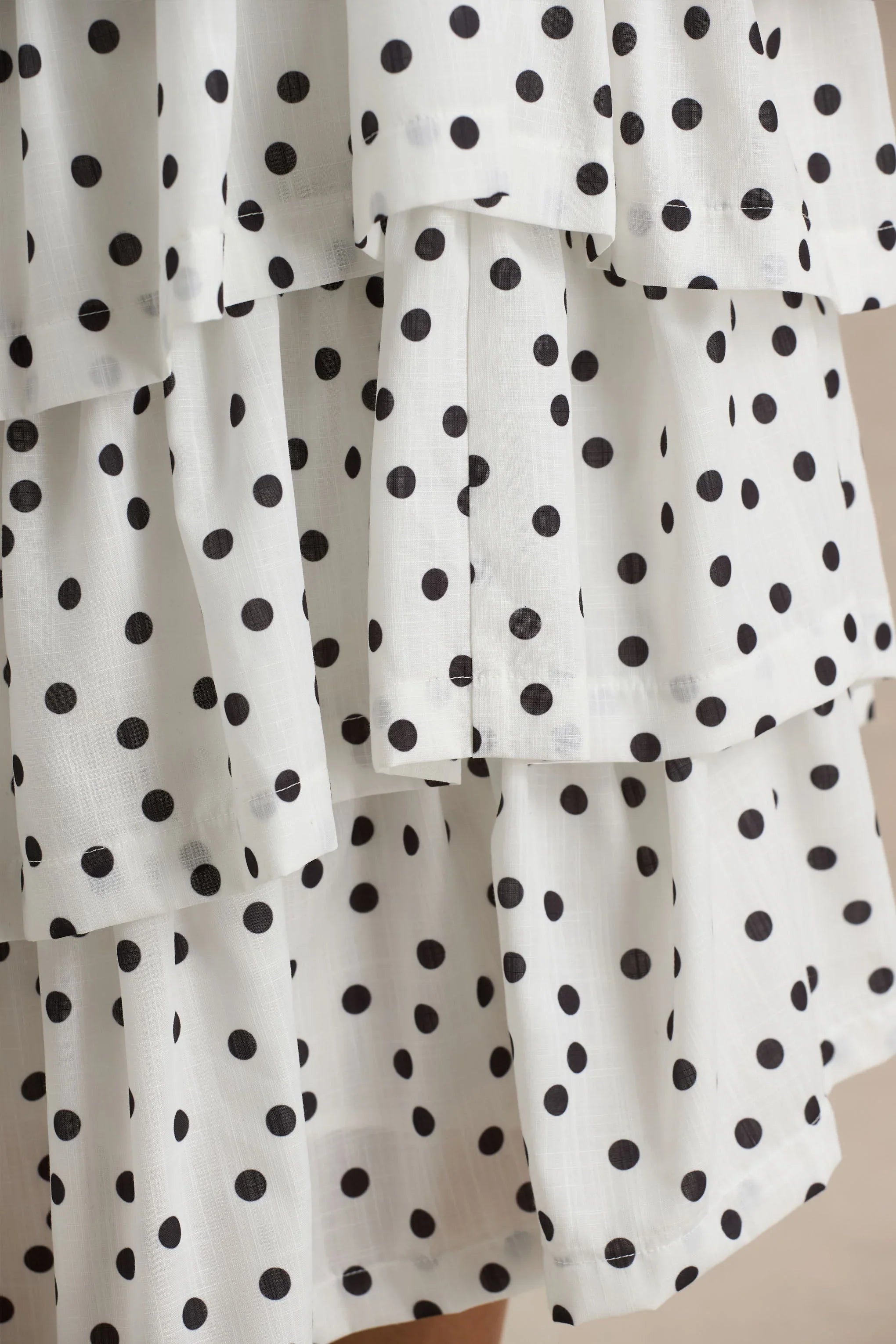 The it dress of the season has arrived, timeless and elegant, say hello to Violet. Crafted in a bold white polka dot print of our premium linen look, this midi dress is perfect for any dressed up moment this season. Violet features a chic self-tie halter neckline, to elegantly display your decolletage, that finishes in a stunning bow detail at the neck adding a touch of romance. The skirt is adorned in ruffling detail that adds a romantic and dramatic edge to this piece, ensuring an eye catching finish. From sunset cocktails that lead to elegant dinners, in Violet you are set for any occasion.
