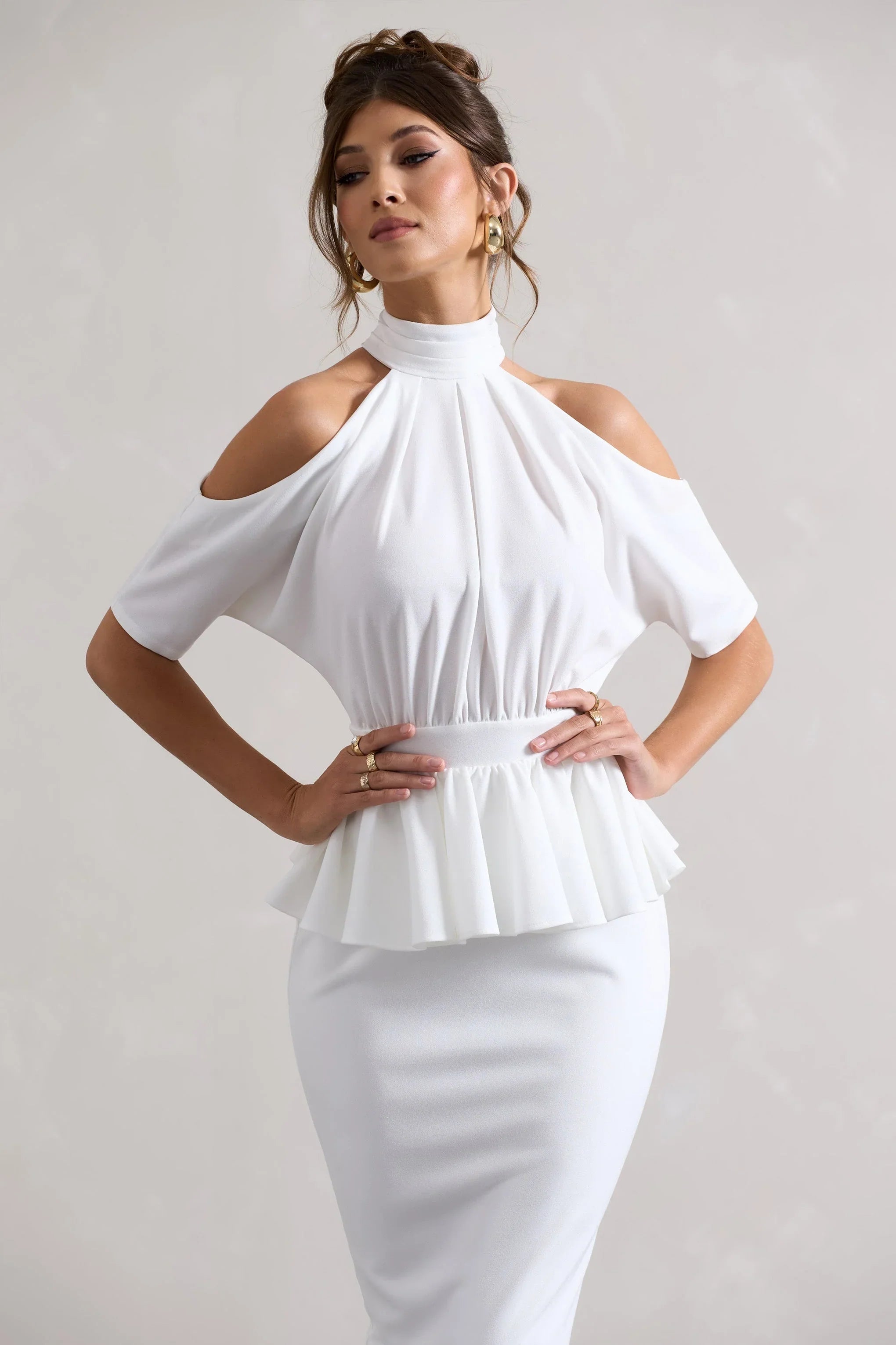 From race days to engagement parties, Yves is an elegant choice. With so many details to love, what defines this white midi dress is its cold shoulder detail and peplum waistline.