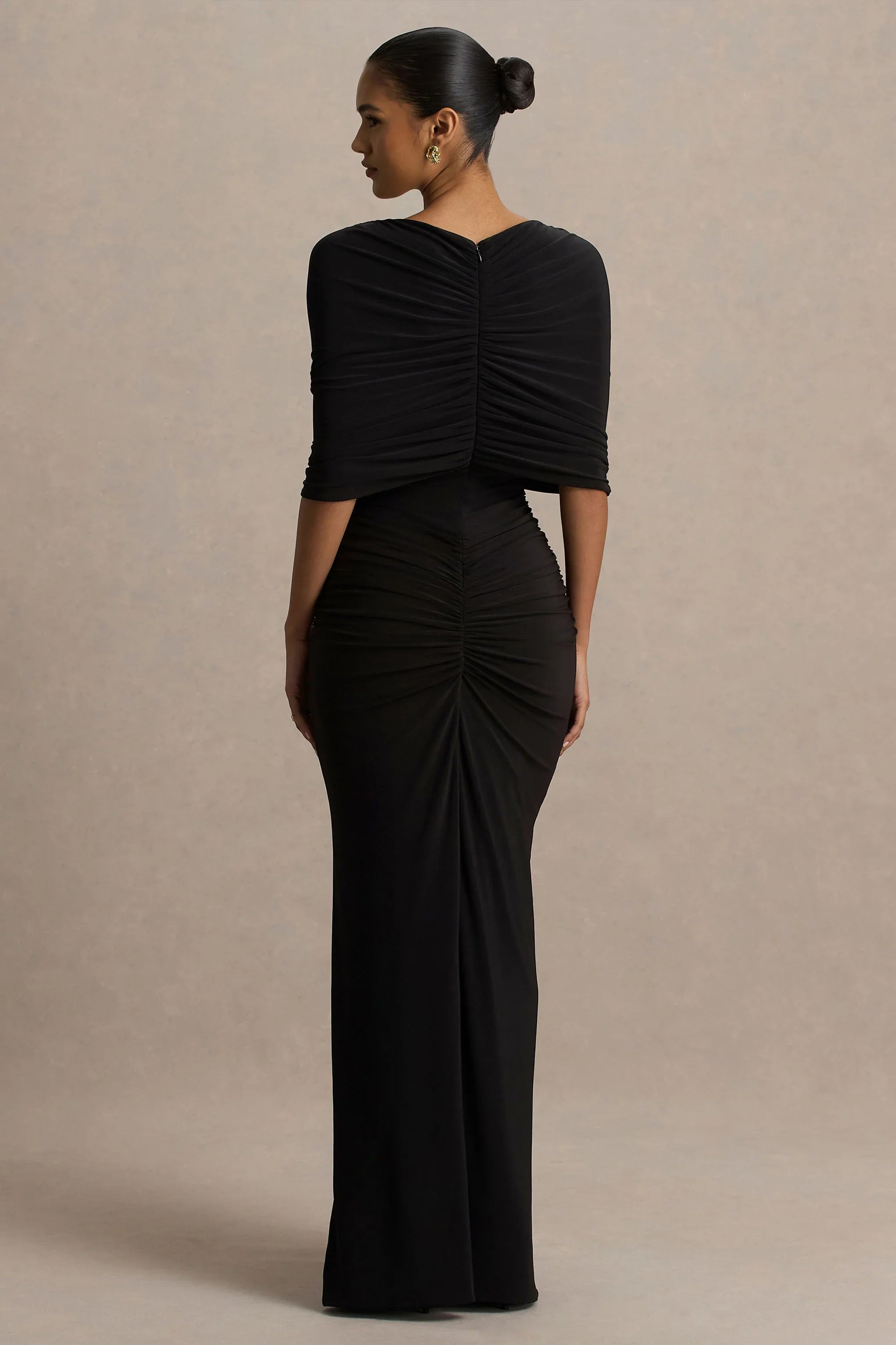 A true showstopper, Zinnie is designed to sculpt and flatter while making a bold statement. Crafted from our premium black stretch jersey, this maxi dress turns heads in any room. Featuring a daring mesh panel that's balanced with elegant draped detailing across the bodice and cape sleeves. The ruched finish creates a cinched, hourglass effect, flowing into a sleek floor-length skirt for a powerful silhouette. Zinnie is the perfect piece for evenings that demand confidence and allure.