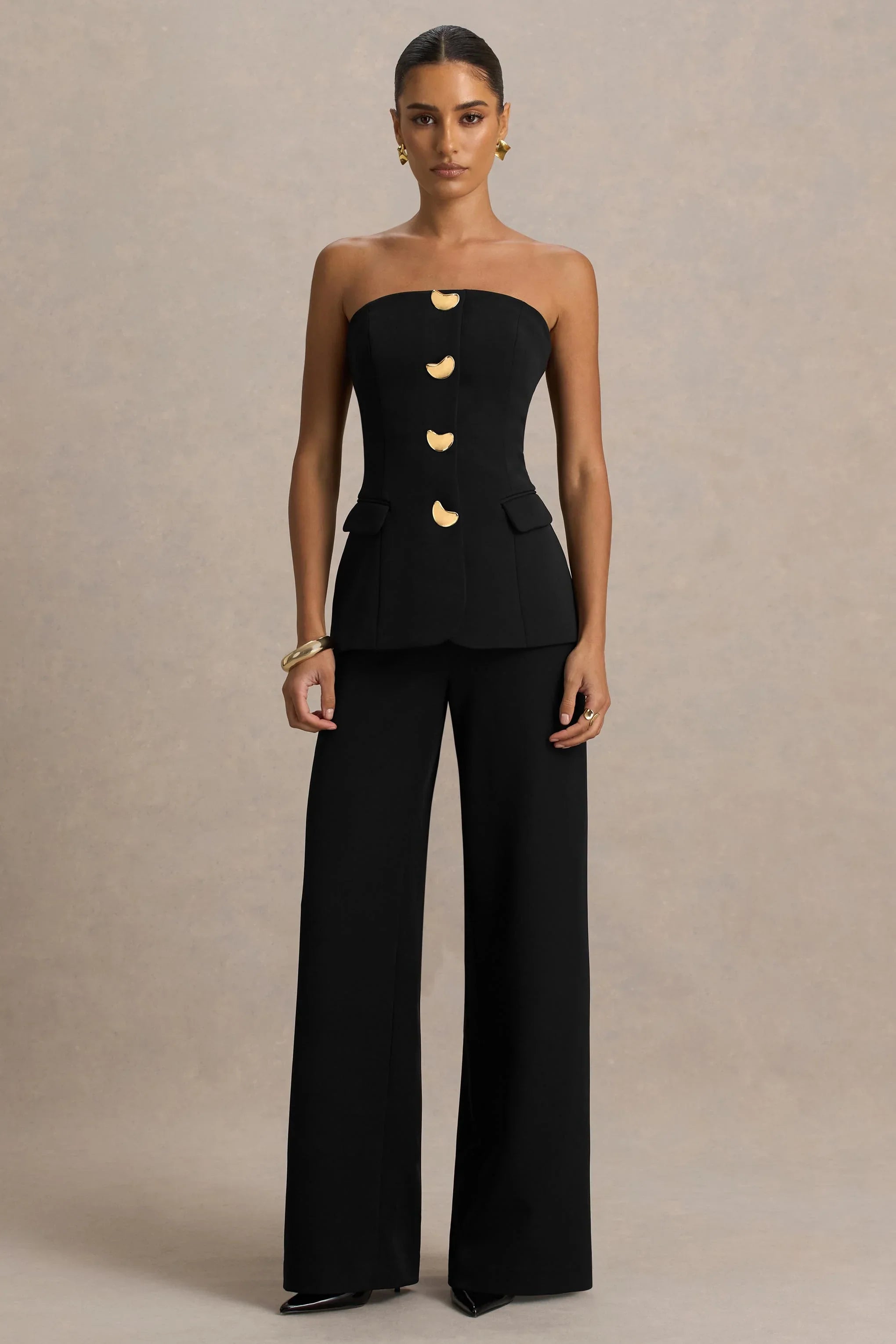 Zoey is the statement jumpsuit that oozes sleek sophistication. Crafted in our premium black crepe, this tailored wide-leg piece is perfect for making a statement. Featuring a flattering bandeau neckline and subtle gold hardware detailing down the bodice for a polished, luxurious finish. Designed to elongate and flatter every silhouette, Zoey combines elegance with modern edge, perfect for cocktail evenings, parties, or any event where you want to command attention. Sophisticated, striking, and effortlessly chic.
